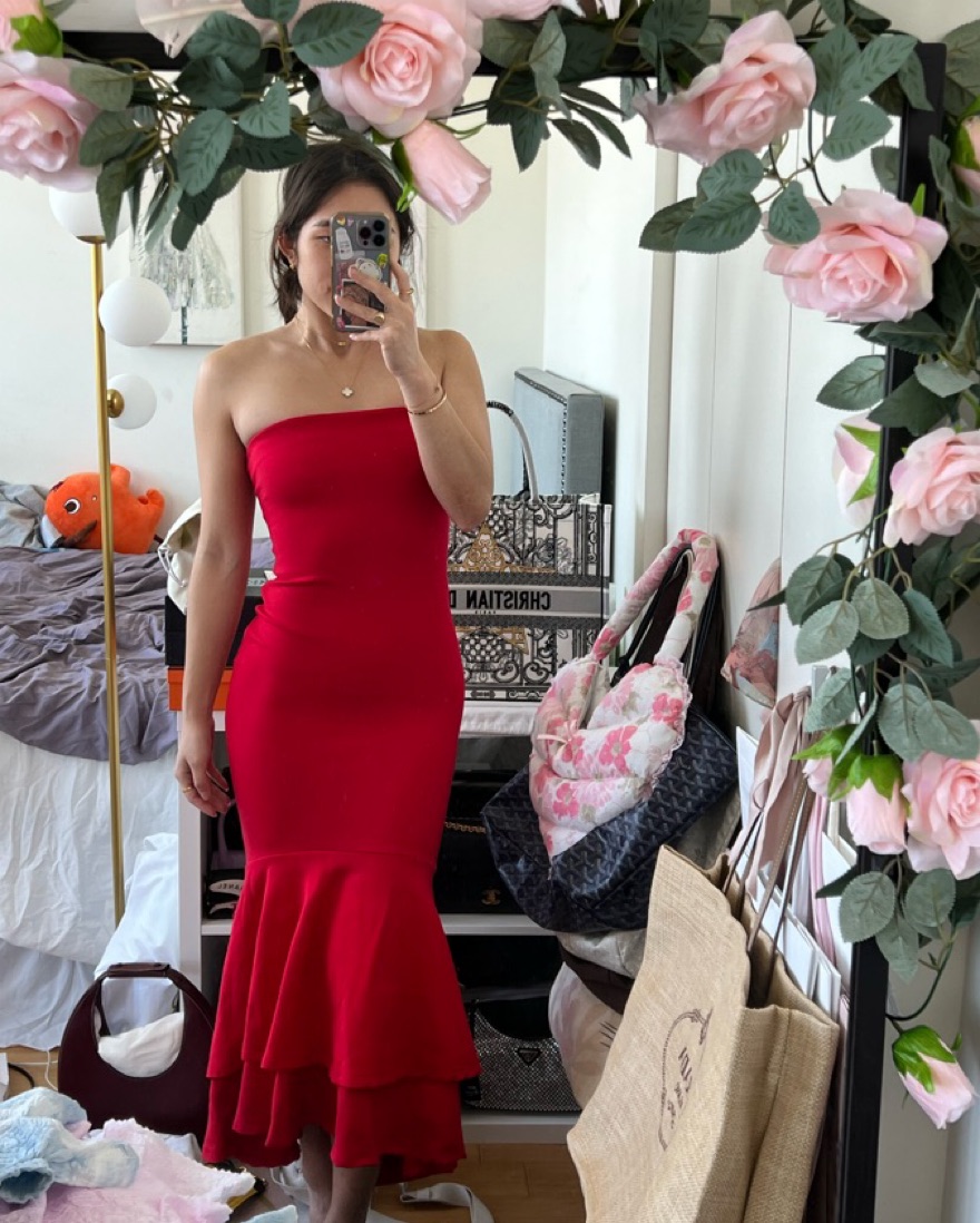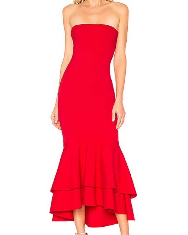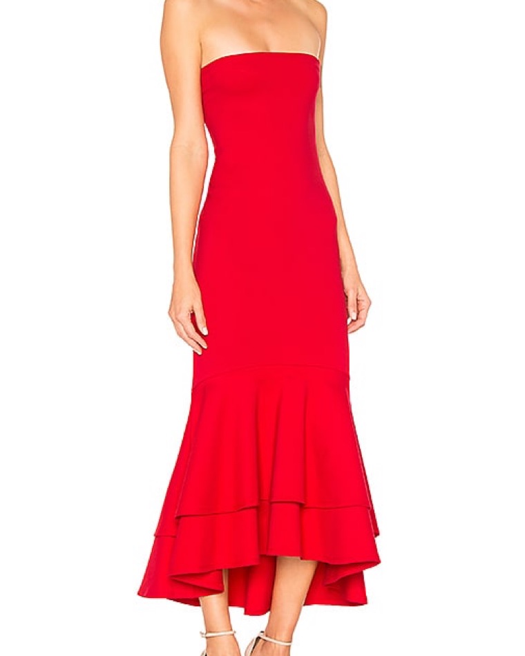 A vibrant red hue ensures all eyes on you. Lovers + Friends Dillion Midi features strapless styling and a body sculpting silhouette that leads to a ruffled drop waist skirt.