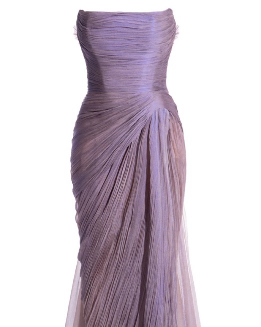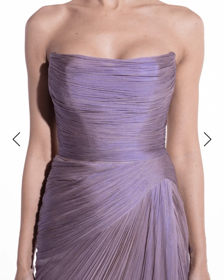 This stunning lavender gown features a ruched, draped design that creates a graceful, figure-flattering silhouette.