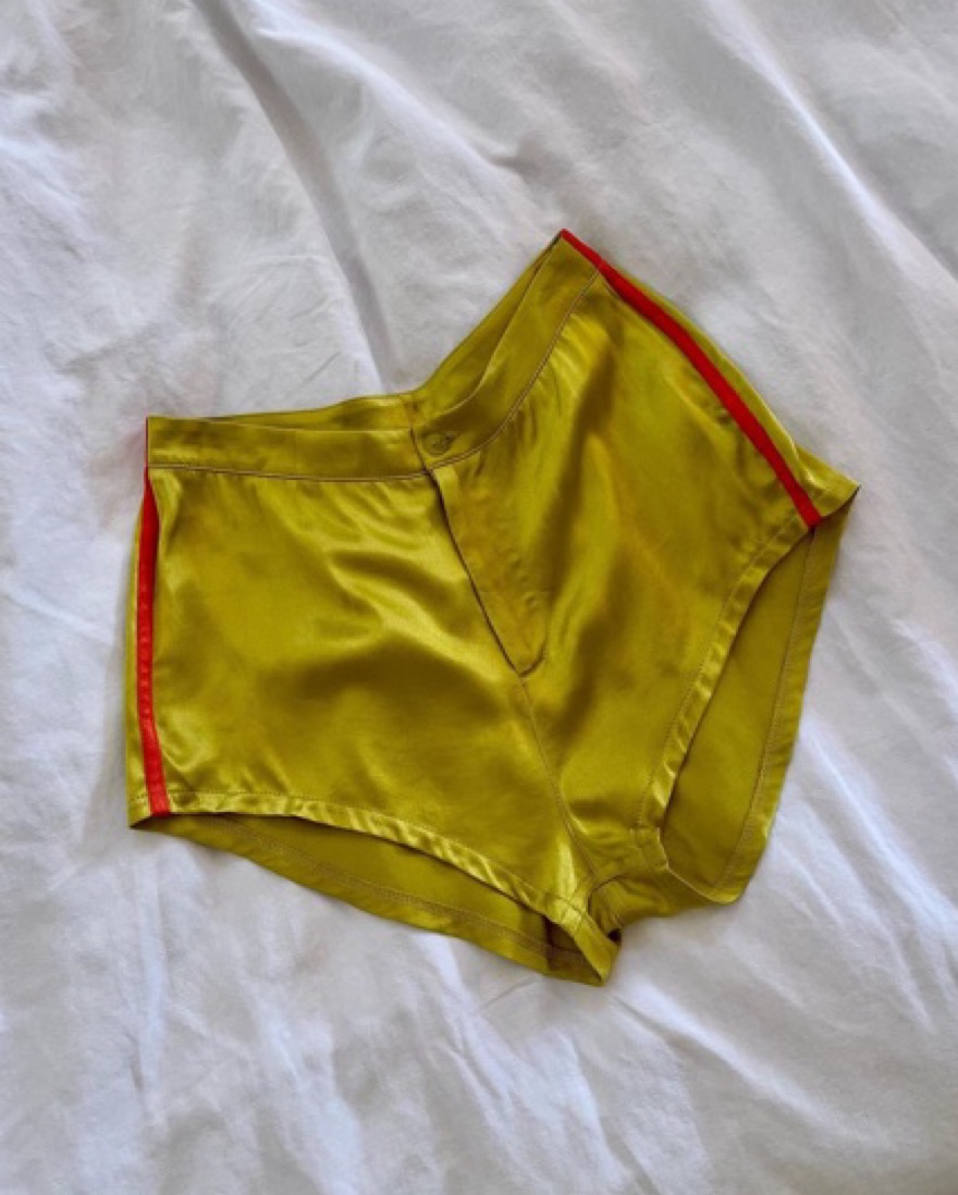 Size xs shorts (24” no stretch). Silk. Snag easily (none so far!) so handle with care!I have the matching halter top if you want to add lmk and ill adjust price additonal $. DELICATE**