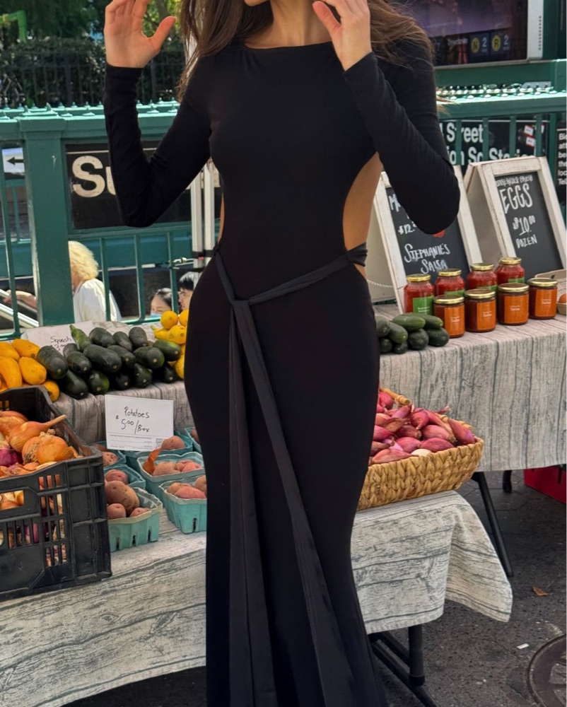 Long black backless gown with an embellished waist tie detail. Gorgeous fit. I have 2!