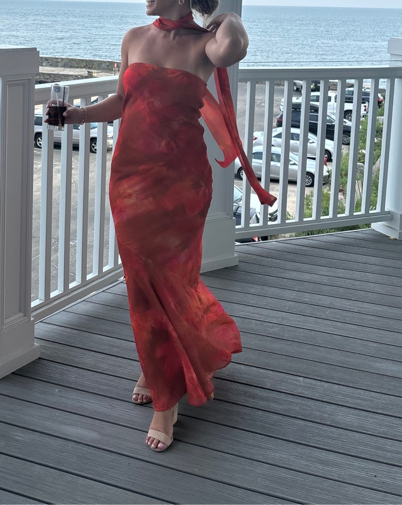 Strapless maxi dress with with chic scarf detail. Orange floral-like pattern. Like new (worn once)!