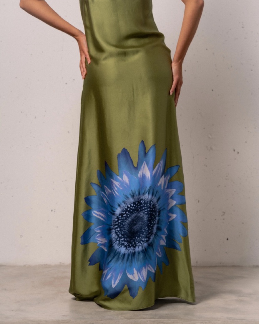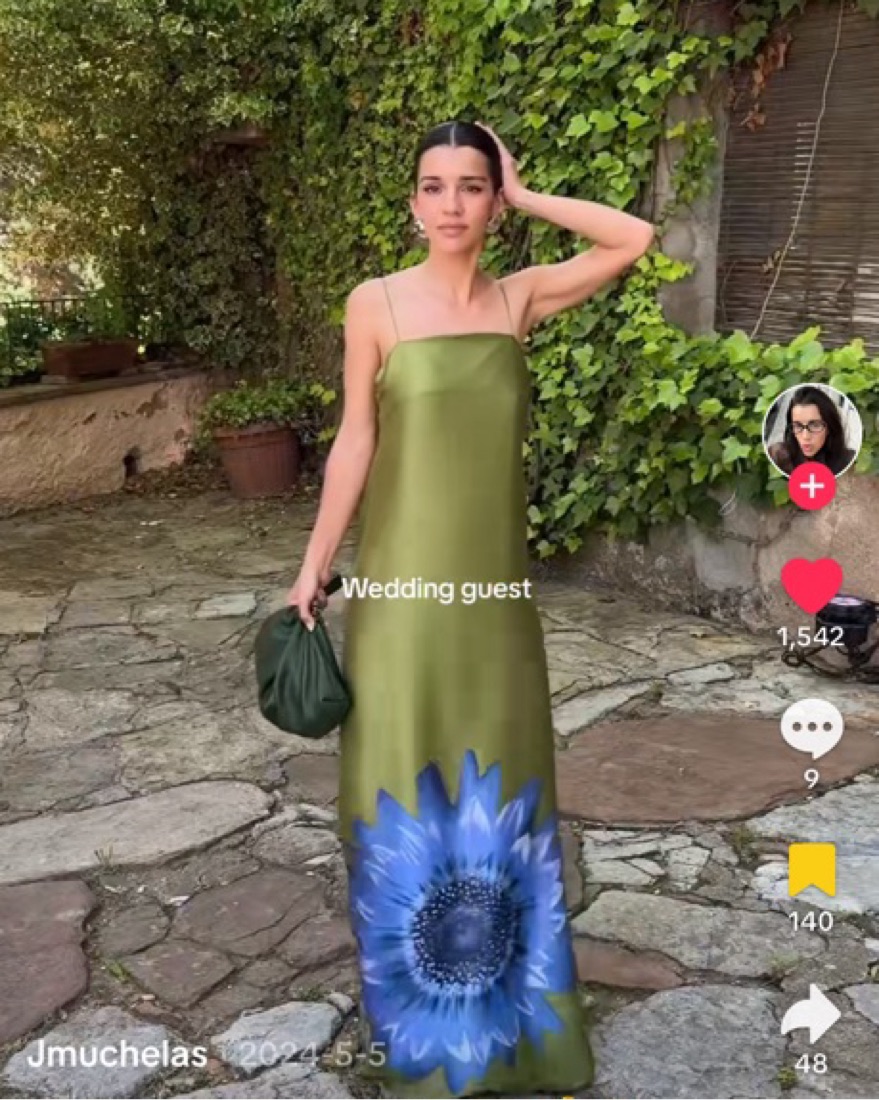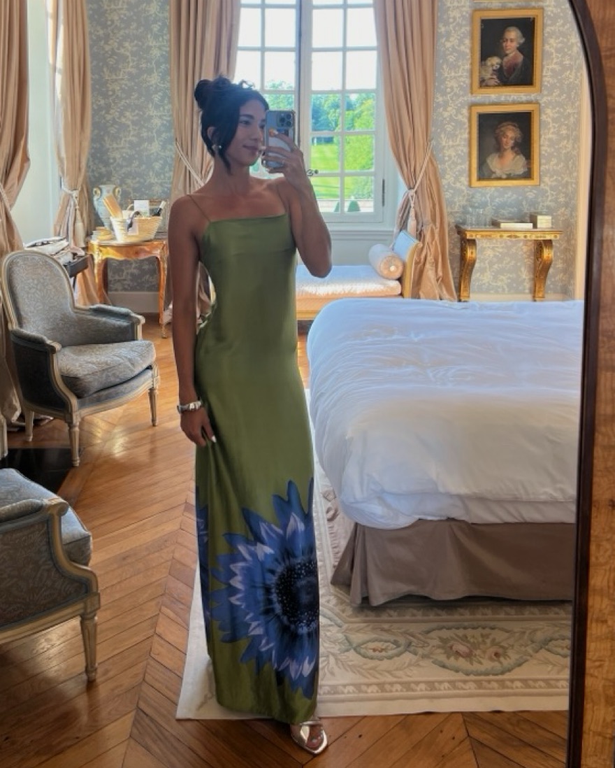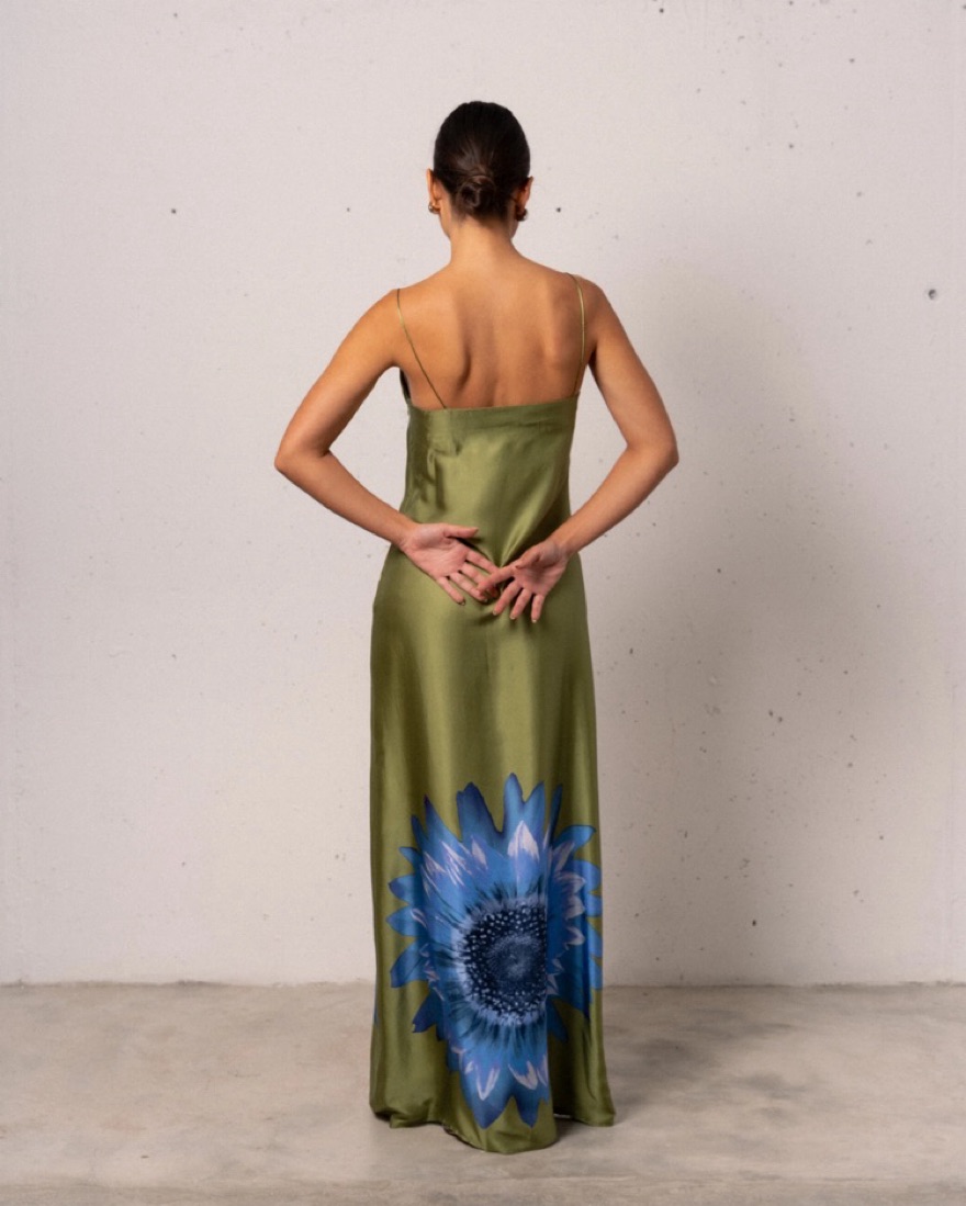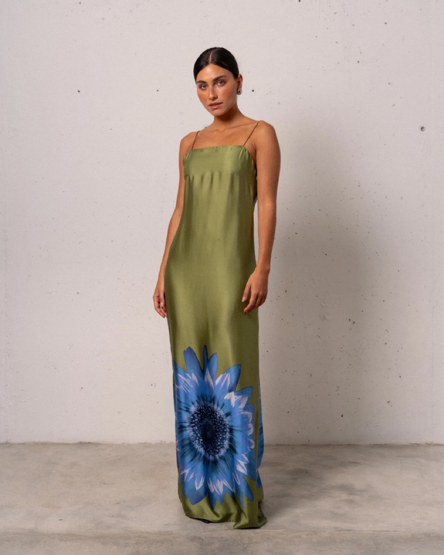 Sold out dress from Nutka Studios (Spanish Boutique) Beautiful floor length green dress with a flower detail. Fits closer to a small / size 6. Perfect for a summer wedding. Similar to arcina ori, for love and lemons, rat and boa, cos, ect