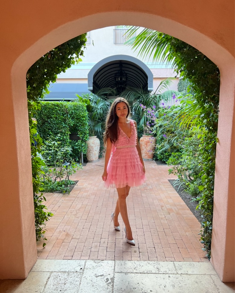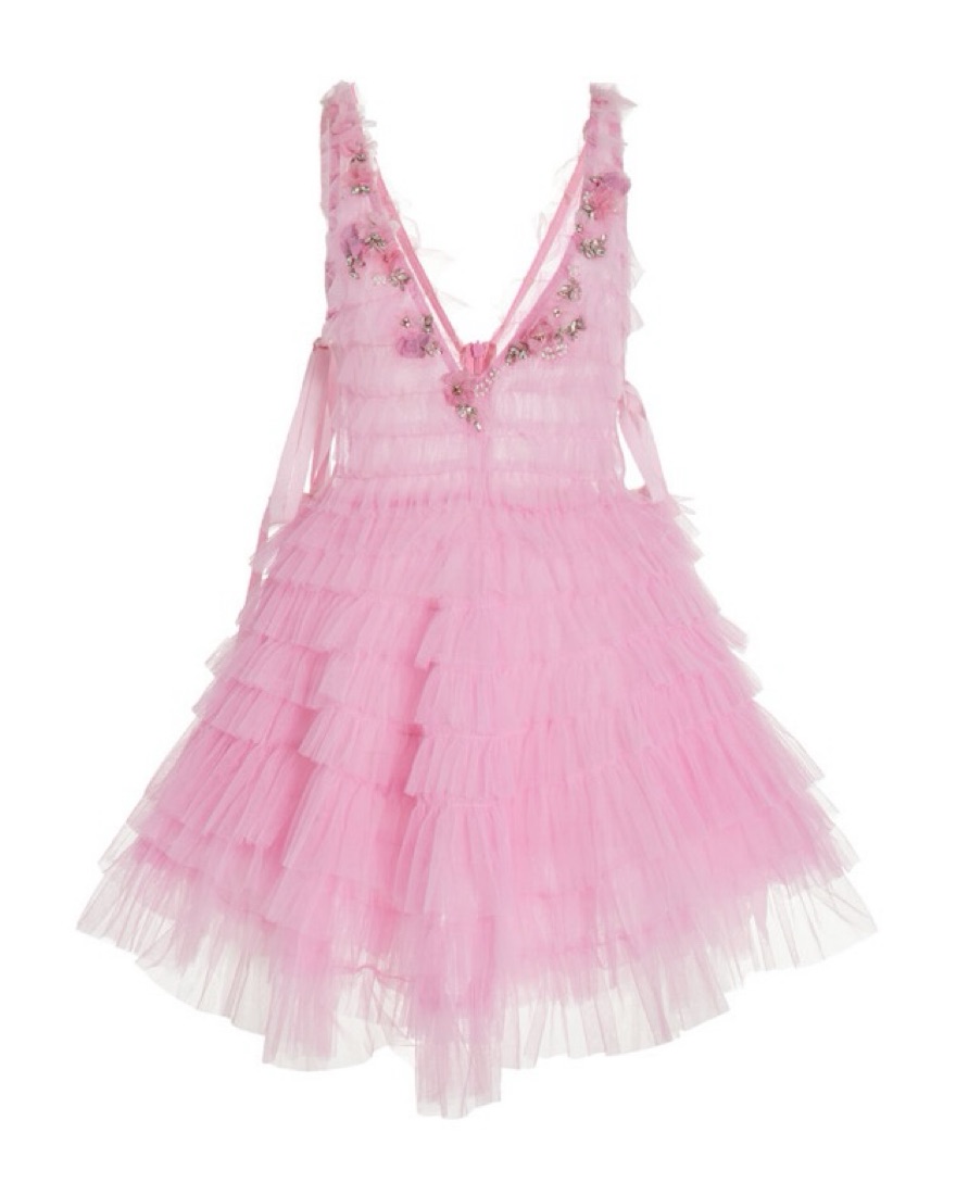 The pink dress is a stunning array of floral appliqués, ruffles, and crystal embellishments constructed into an A-line, mini dress with a plunging neckline. Style with jeweled heels and a mini clutch for a playful party look. Worn for two hours! New!
