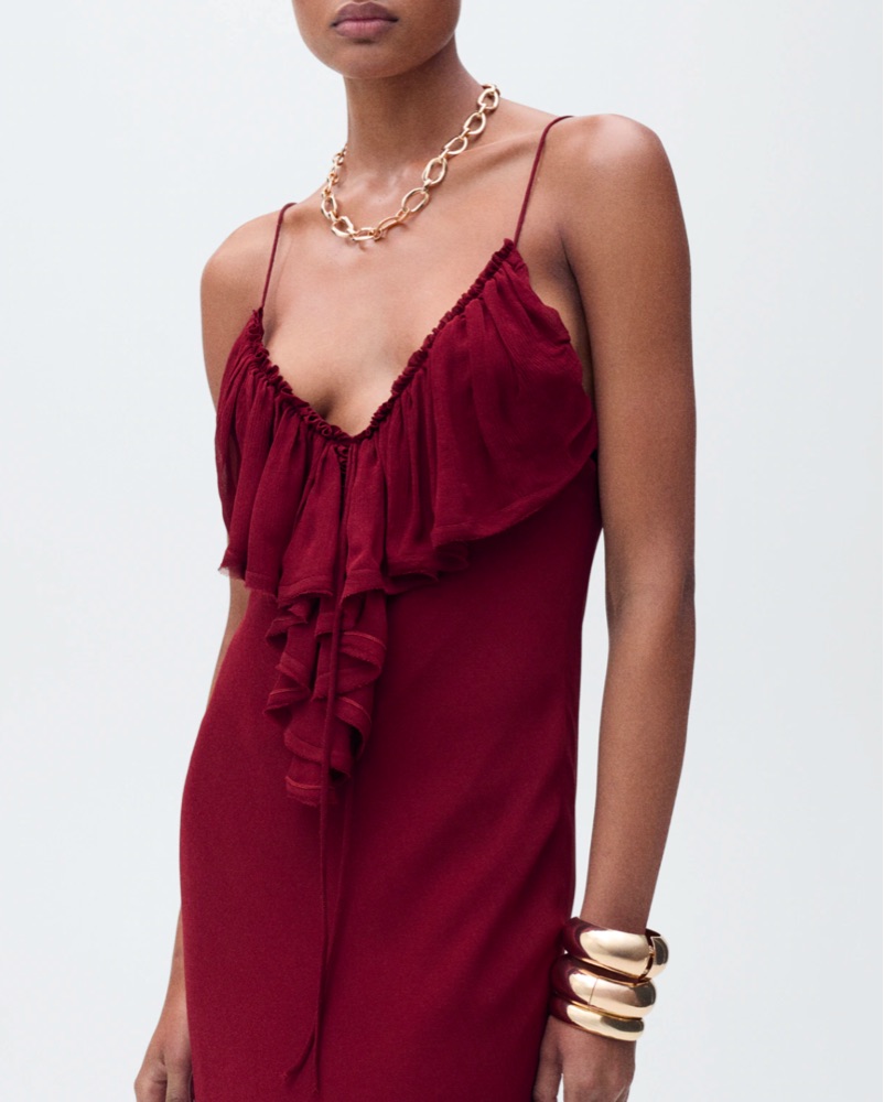 Mango maroon chiffon slip dress with vneck and ruffle detail. Adjustable straps.