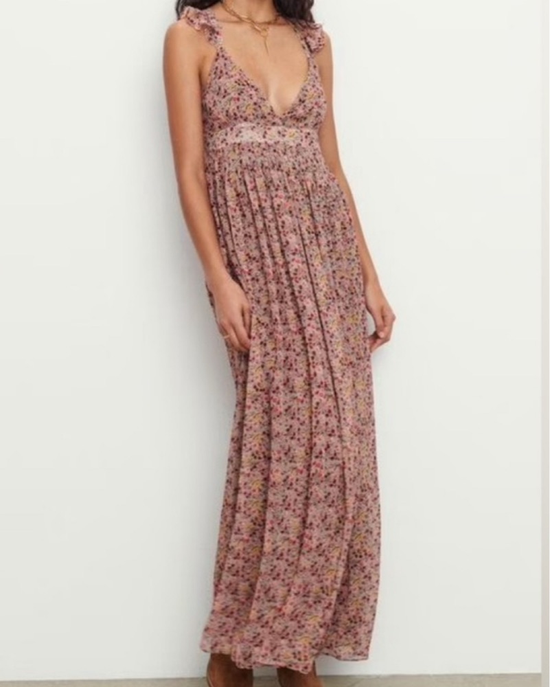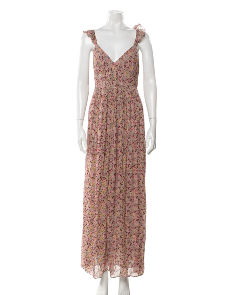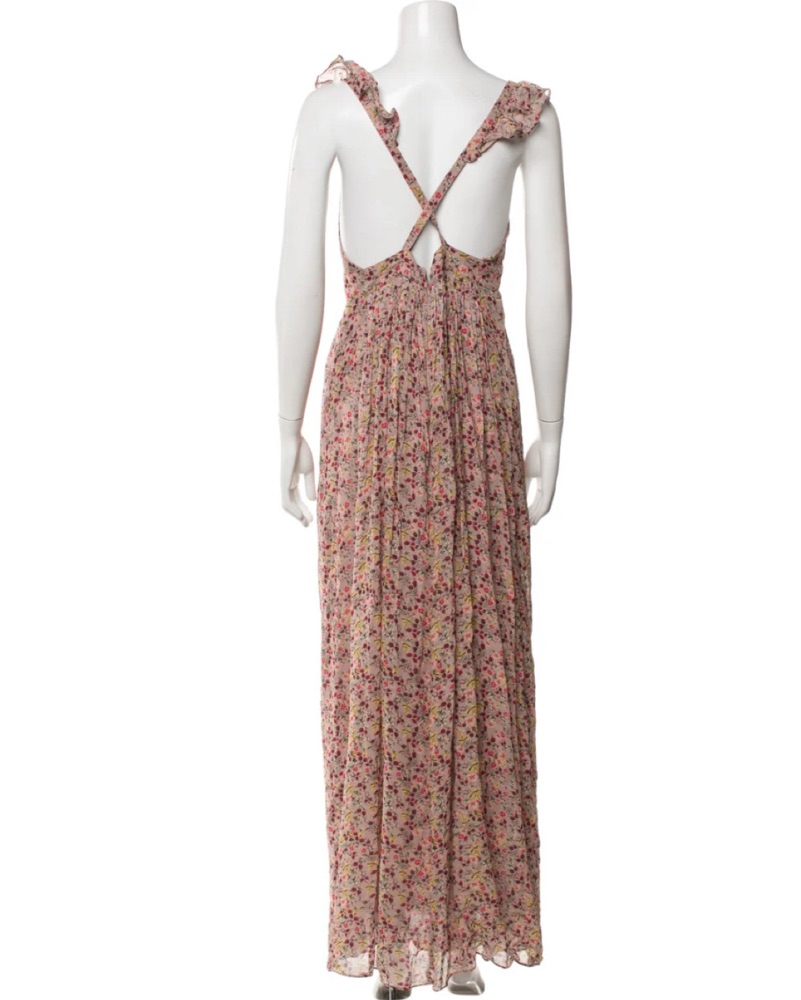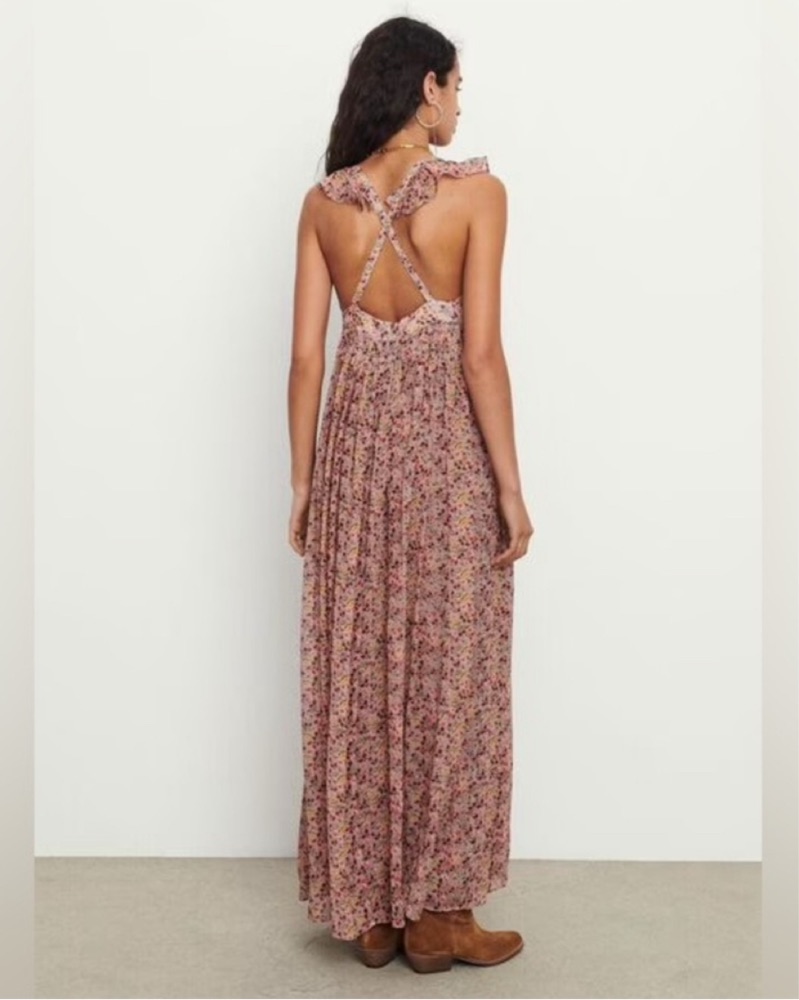 The Madison dress from Ba&sh is cut in a beautiful flowy Beige fabric and enhanced with a pretty floral print. It features a sleeveless design and narrow ruffled straps that crossover in the back.