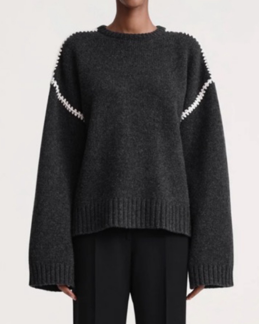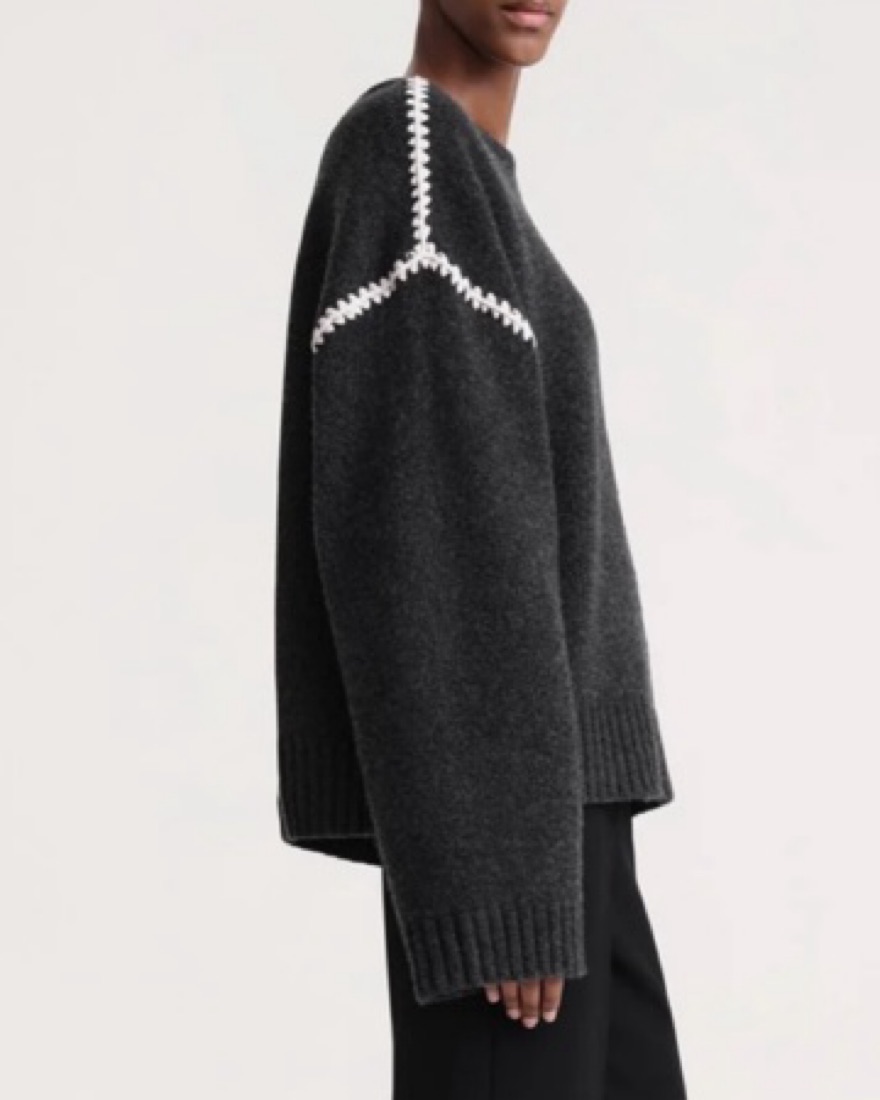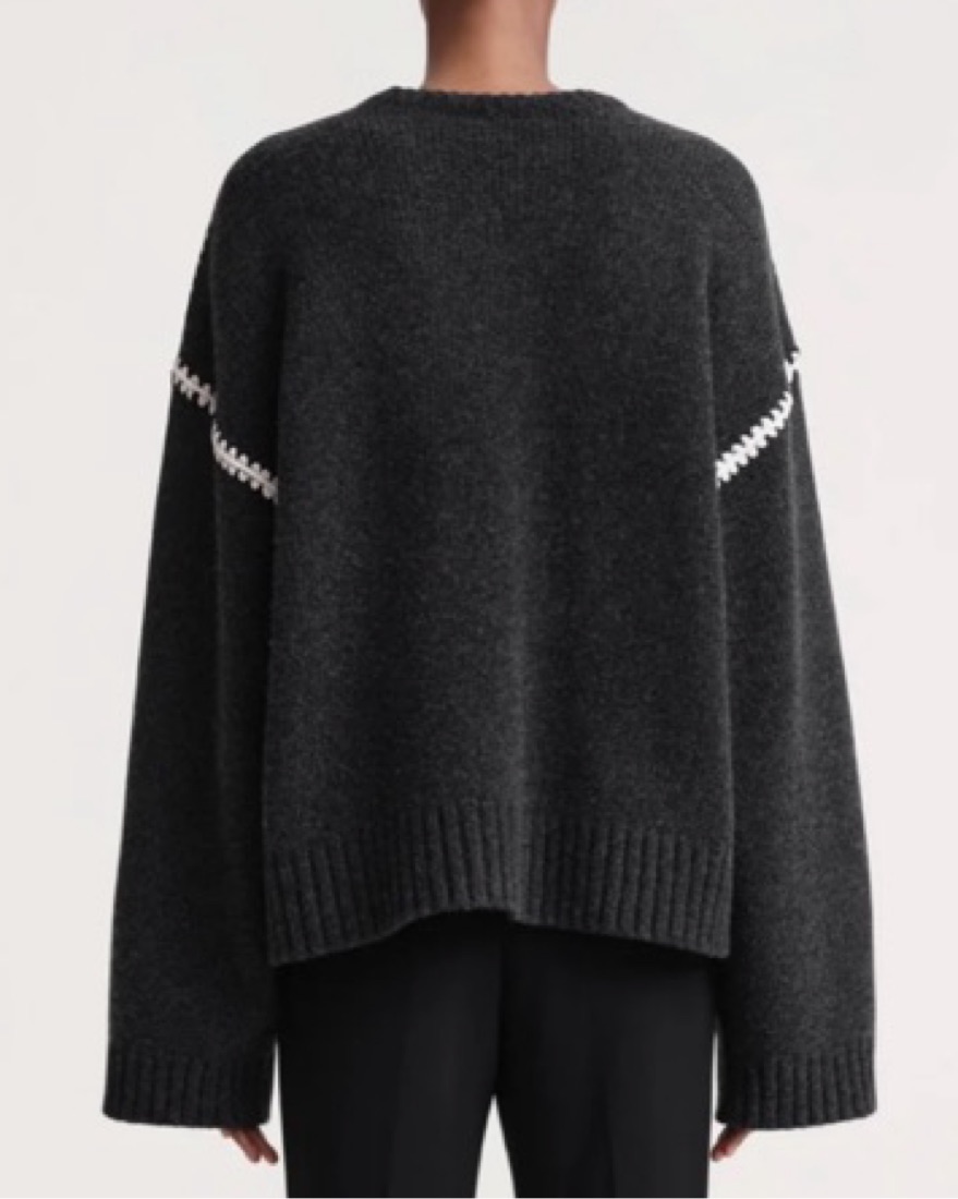 The embroidered wool cashmere knit in grey melange is a wide sweater inspired by TOTEME's Embroidered scarf jacket. It's knitted from mid-weight wool with a touch of cashmere for warmth and softness. It features an embroidered pattern along the shoulders and armholes with contrasting thread.