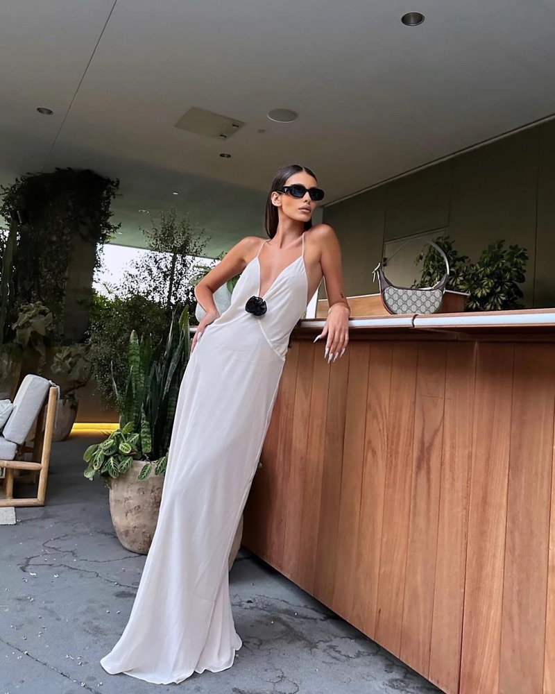 One of my favorites! Size small. Fully lined. So flattering!! Plunging neckline with detachable rose detail. Pull-on styling. Please handle with care :) Tags: helsa dress, rose dress, bachelorette dress, white maxi, birthday dress, vacation dress, date night dress