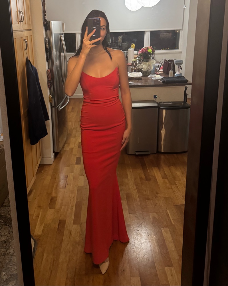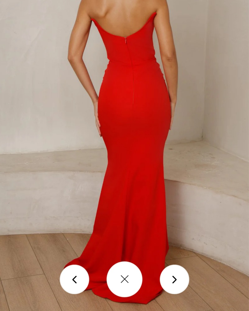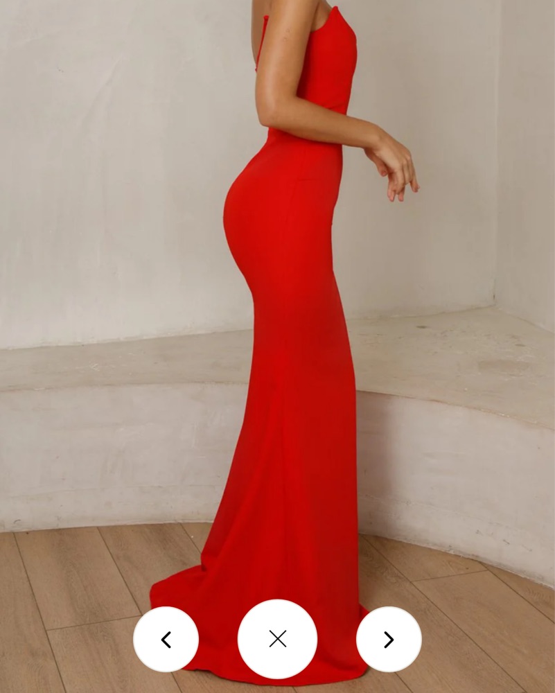 Fully structured bodice. Curved neckline in front and back. Invisible zipper. I typically wear a size Small or US4 - sized up as this is an Australian brand. Fit like a glove. I am 5’10 and wore 3.5in heels. My measurements: 34B, 27, 38