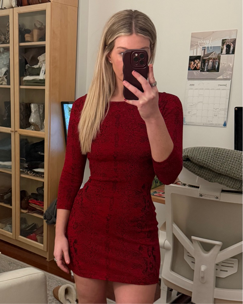 Circa 2003 red and black snake skin print long sleeve open back mini dress. White House Black Market. Size medium. Would fit small (my size in photos) to medium. Recently hemmed to mini length (I’m 5’5 here) and size small.