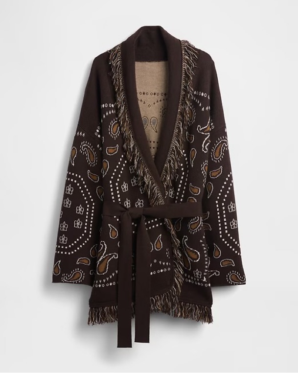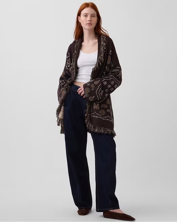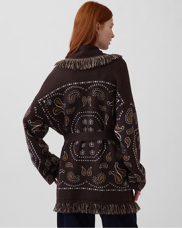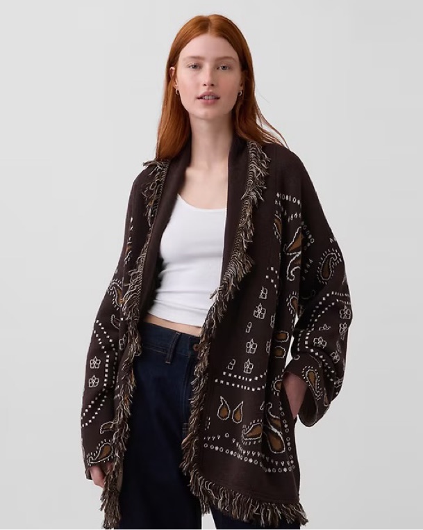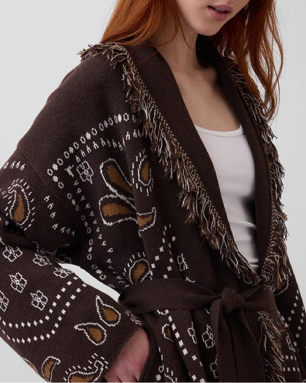 Gap Fringe Shawl Cardigan in Terra Brown Bandana. This Western-inspired statement layer is a perfect transitional piece. Tagged a size M/L, but could comfortably fit a range of sizes given the fully adjustable waist! NWT, sold out!