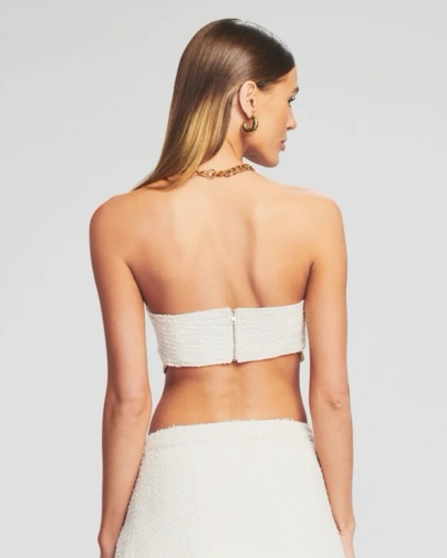 Retrofete Loris Bra Color: White Size: M Back zipper and small plastic button clasp, with chain detail.