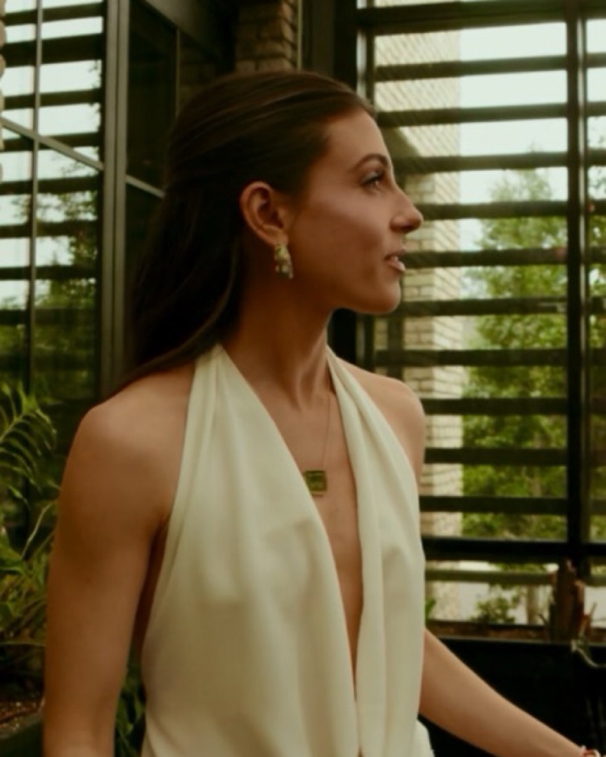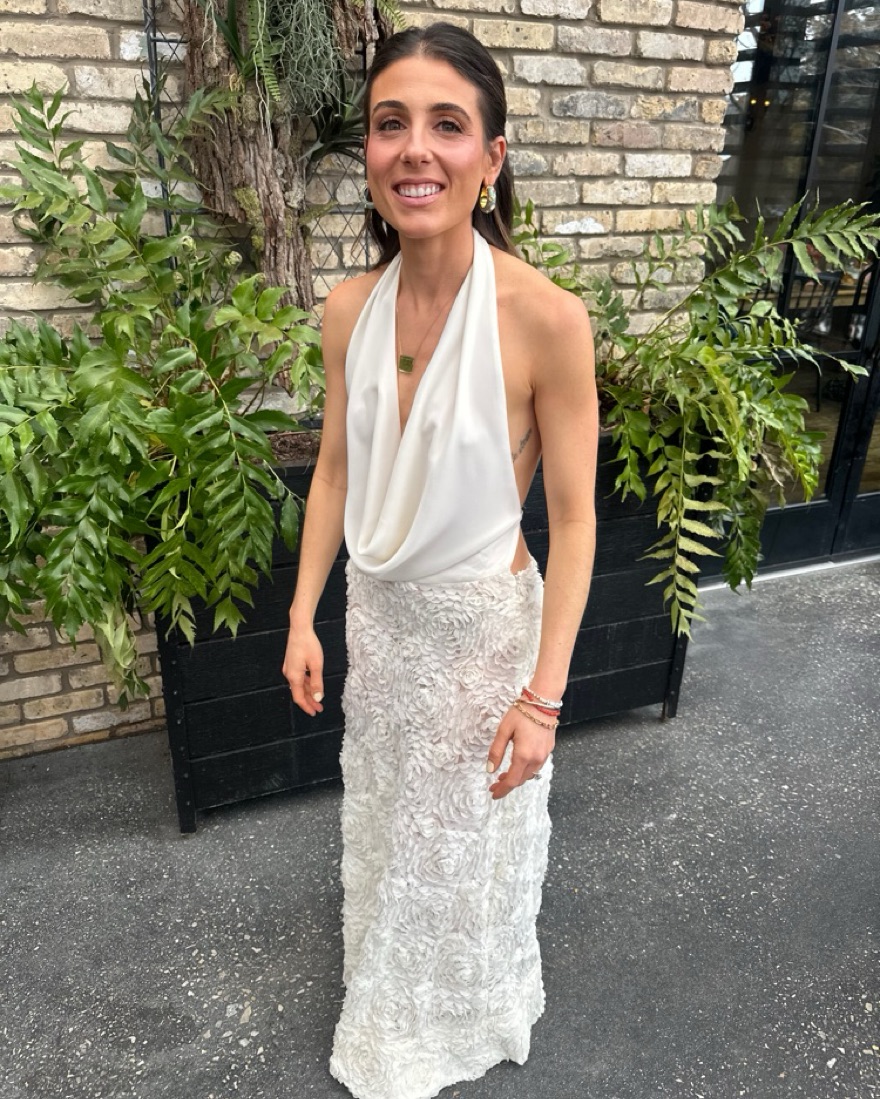 This stunning ivory gown is perfect for a formal event or special occasion. The draped halter neckline and lace skirt create a chic and glamorous look. I’m 5’2 wearing about 2 inch heels.