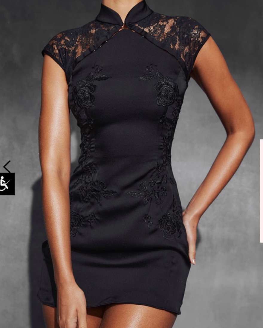 Gorgeous black mini dress with lace and embroidery. Zips up the back stretch factor 1/3. Extremely flattering and gives you an hourglass figure! Worn once!