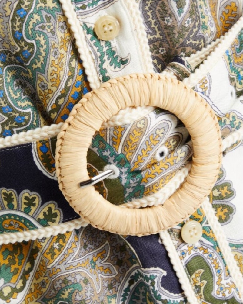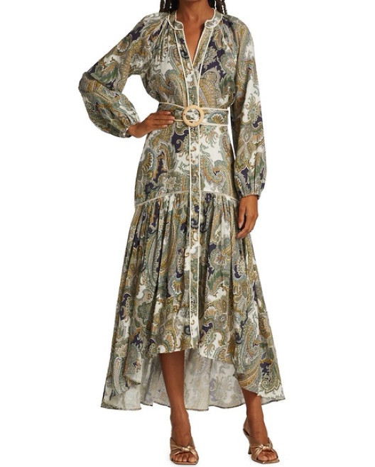 This beautifully tailored midi dress features a bold paisley print in an array of earthy tones. The flowing silhouette and fluted sleeves make it perfect for a warm-weather event or date night.