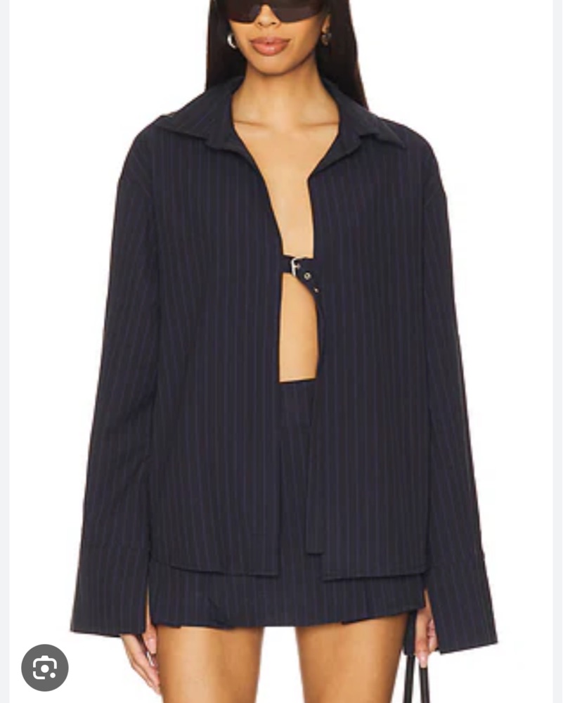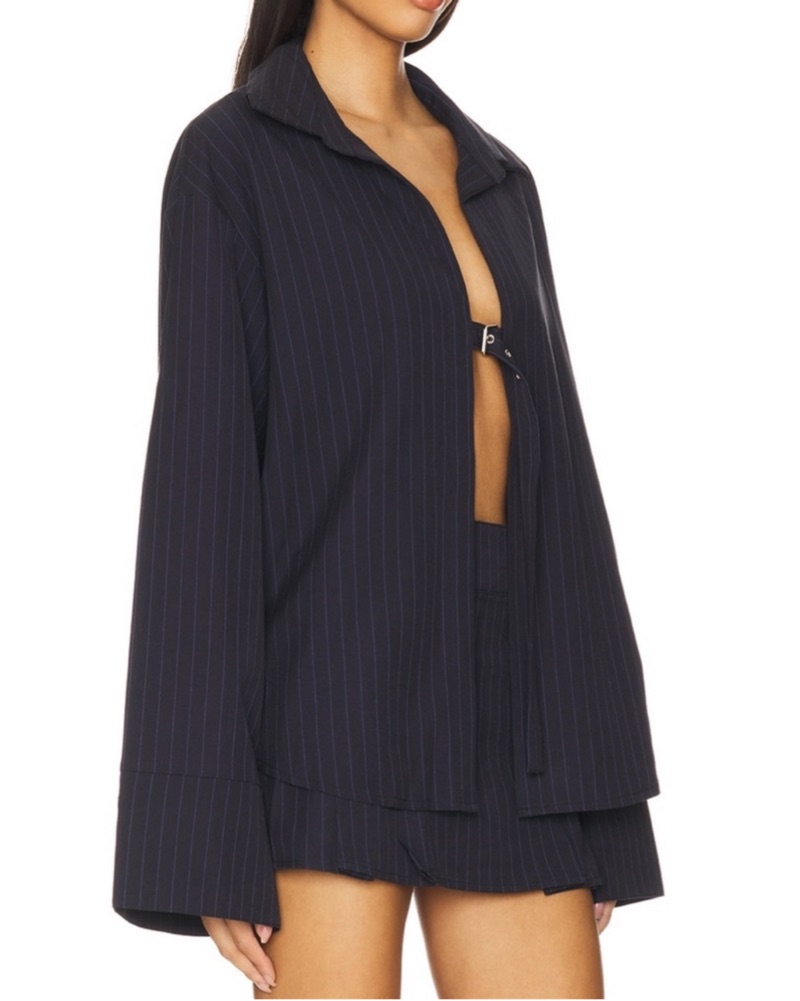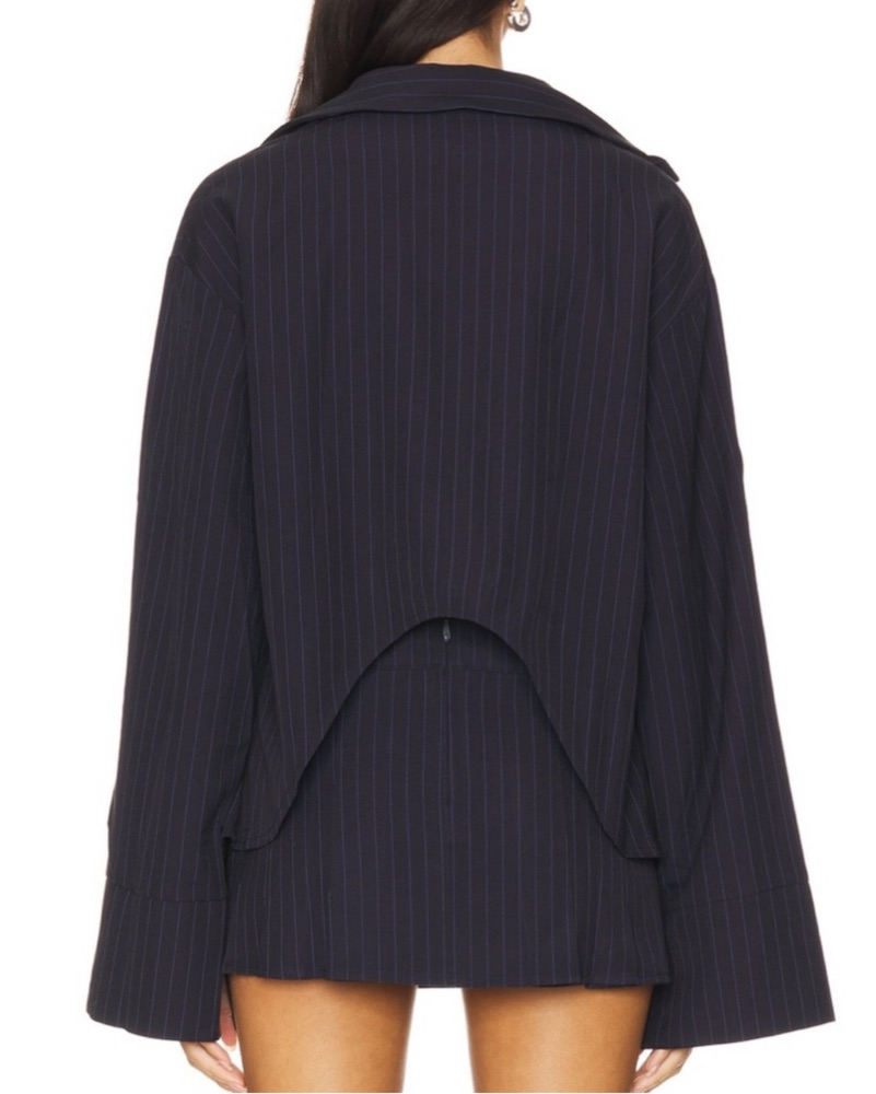 80% polyester, 16% rayon, 4% elastane. Made in China. Hand wash warm. Front buckle closure. Pinstripe design throughout. Asymmetrical back hem. Item not sold as set. Revolve Style No. BYDR-WS99. Manufacturer Style No. DL3017.