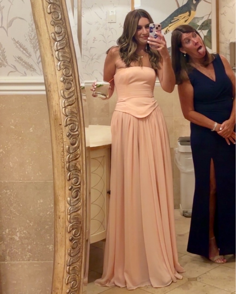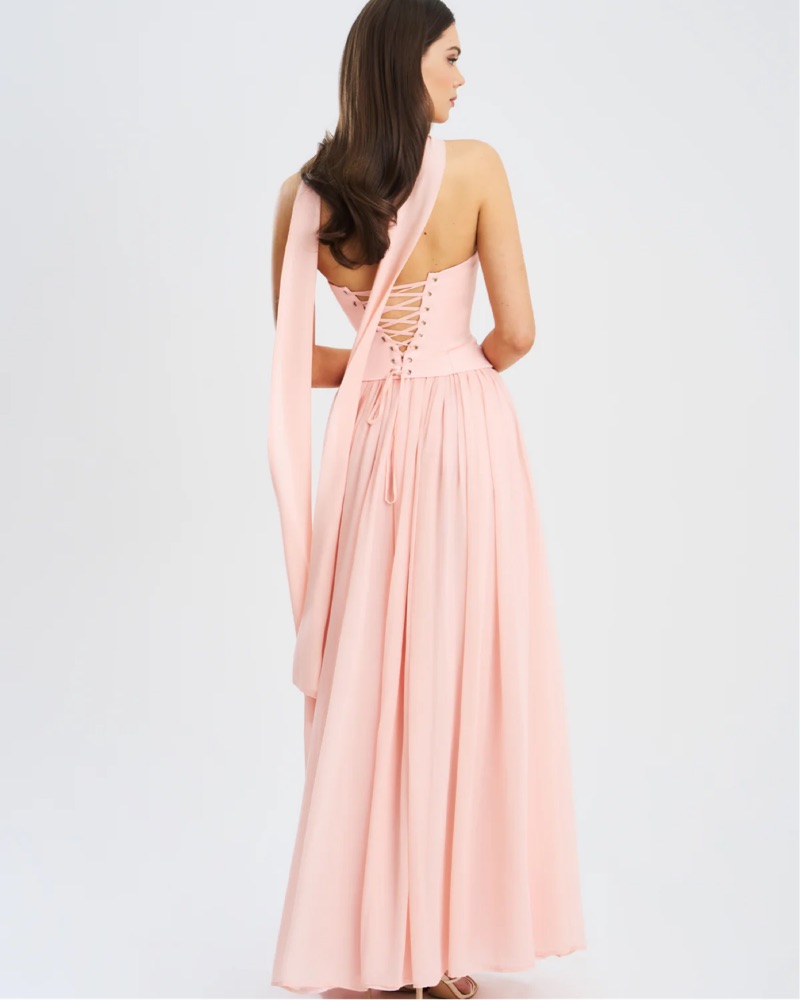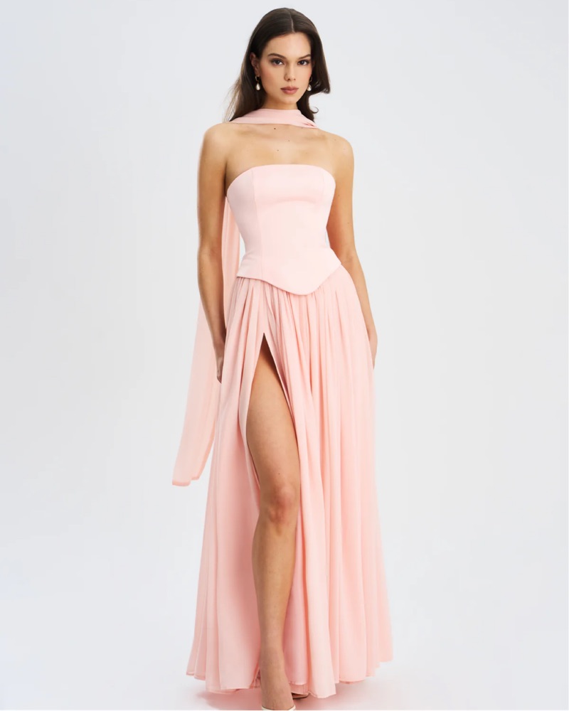 This stunning strapless maxi dress is perfect for a formal event or special occasion. The flowing, pleated skirt and thigh-high slit create a dramatic, eye-catching look. Lace up back. Perfect for a wedding guest! Comes with matching scarfed