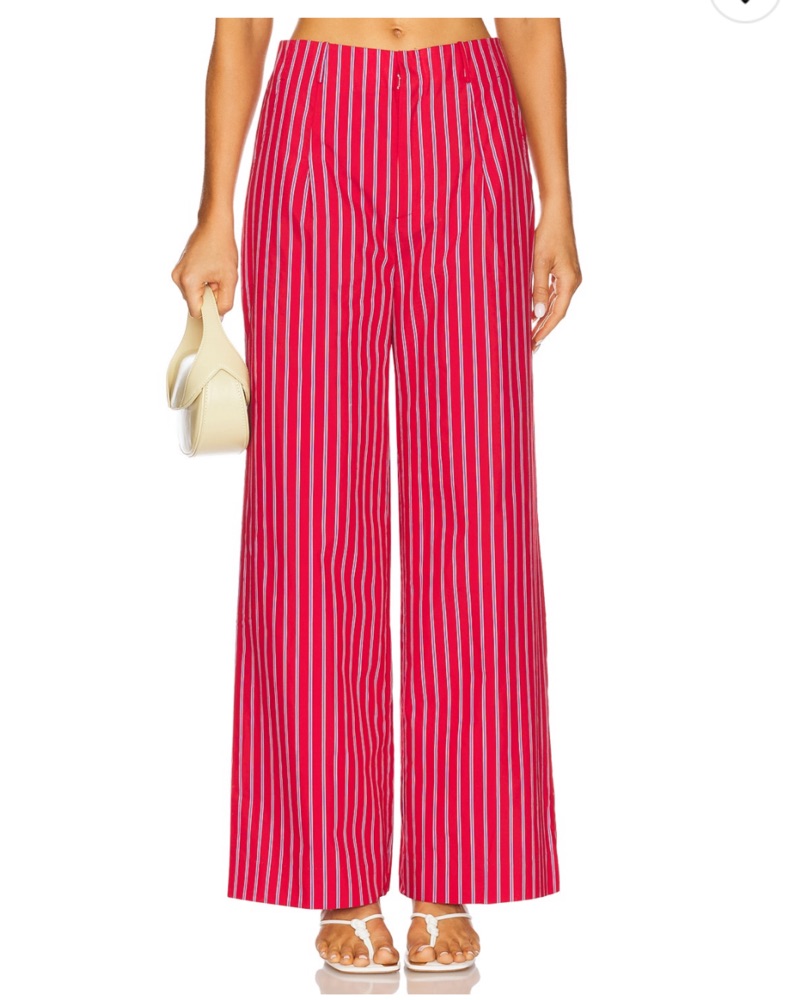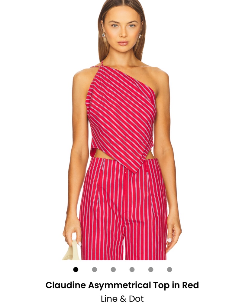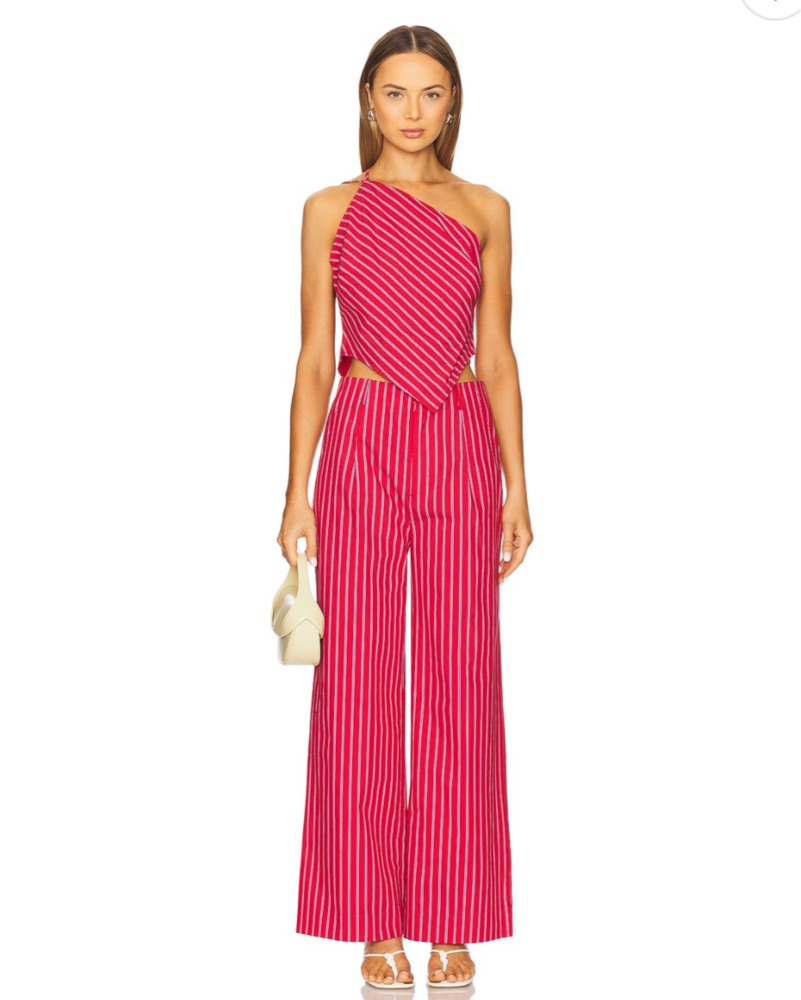 This striking red and white striped set from Line & Dot features a one-shoulder asymmetrical top and wide-leg pants, perfect for a chic summer event or vacation. Size XS