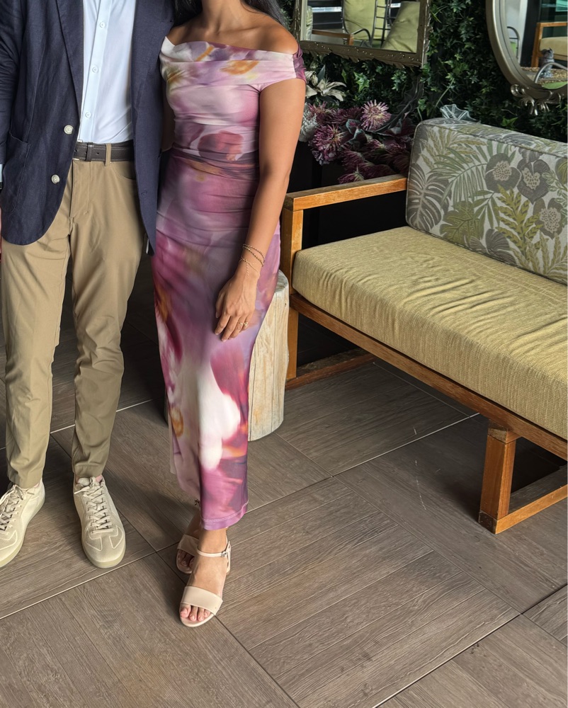 This striking floral swirl maxi dress is perfect for a summer evening event or beach outing. The vibrant colors and flowing silhouette create a chic, modern look. Super comfortable and great for petite girls too :)