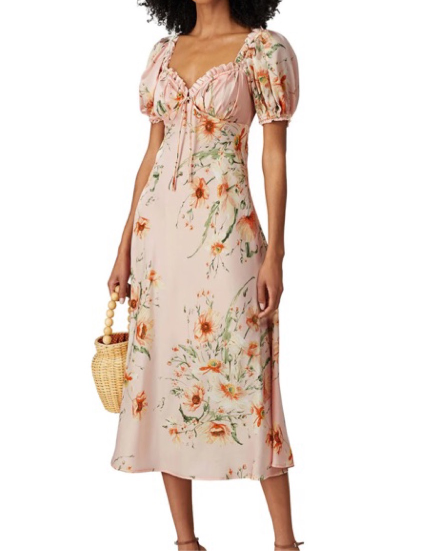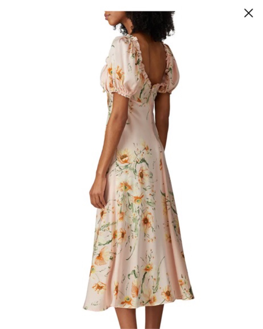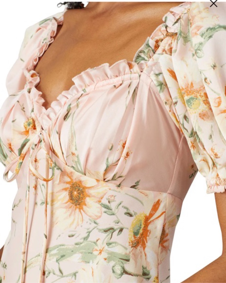 Blush pink floral crepe (100% Polyester). Hourglass. Short sleeves. Sweetheart neckline. Hidden back zipper closure. Partially lined. 51" from shoulder to hemline. Really is super flattering on!