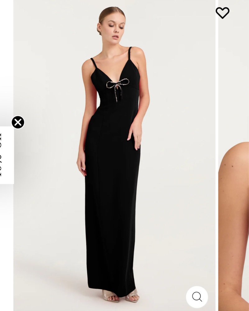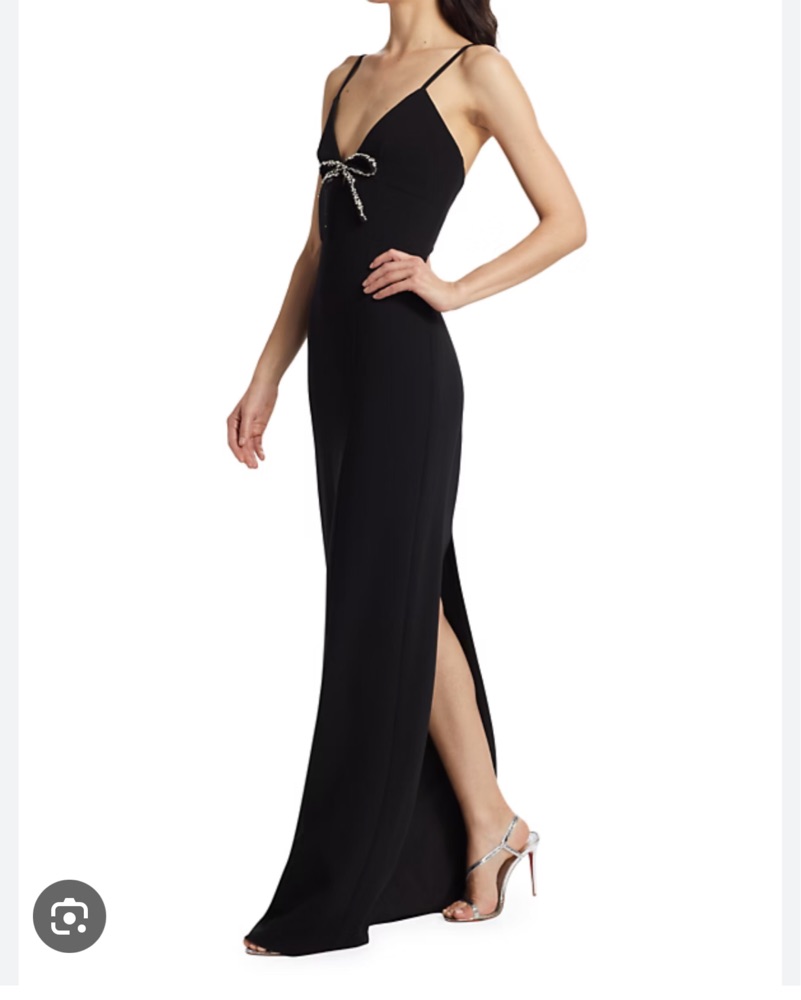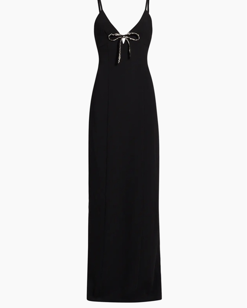This stunning black maxi dress features a sequined bow detail that adds a touch of glamour. Perfect for a formal event or special occasion.