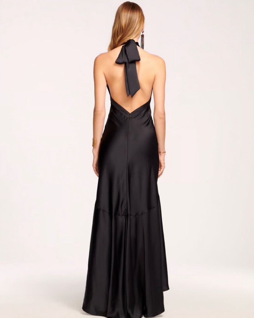 Black satin halter gown with ruffle detail