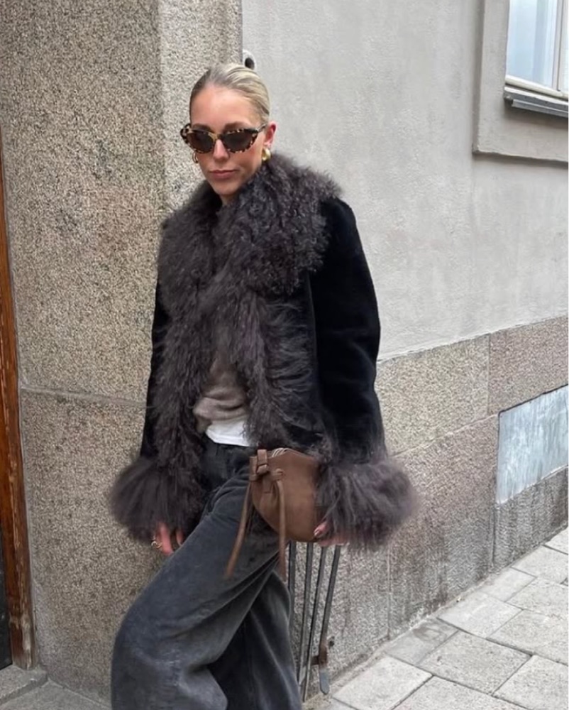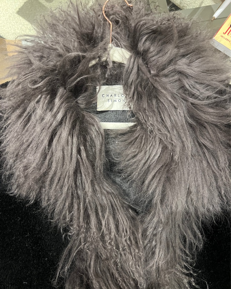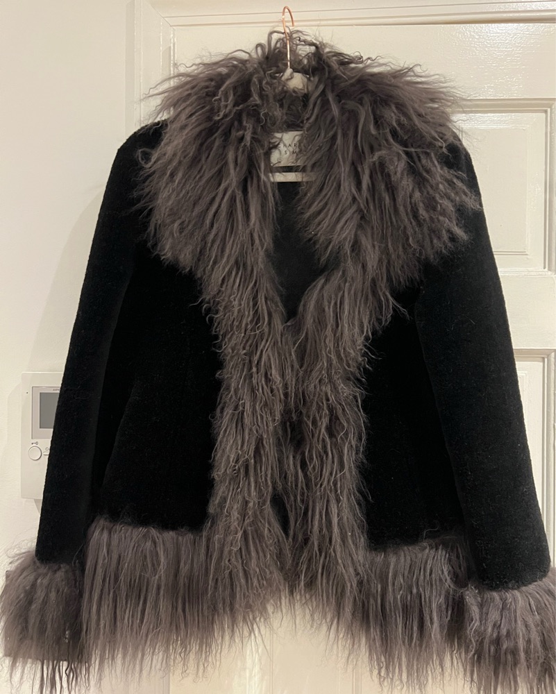Charlotte Simone “Olive” coat, black velvet with brown/grey genuine Mongolian lamb fur trimming.