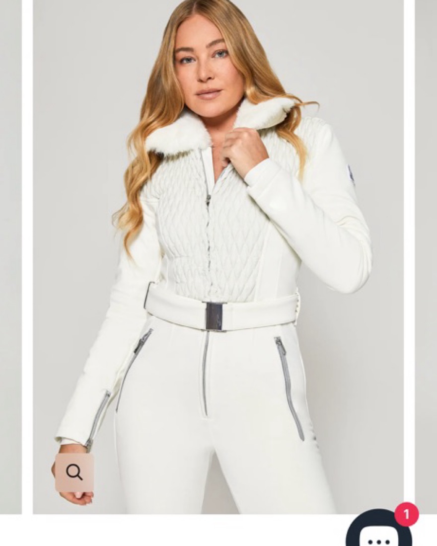 My Sunday ski jumpsuit size small (more of an ivory color than a bright white). Before moving forward with renting the white ski suit, please, Avoid dark color drinks that can stain . If you’re prone to spilling drinks and /or food please reconsider. I have the same suit in darker colors for you.
