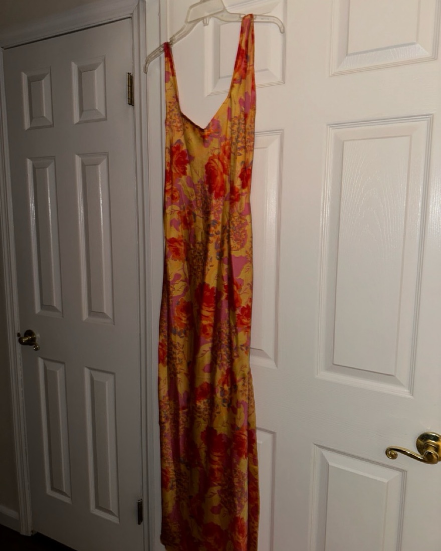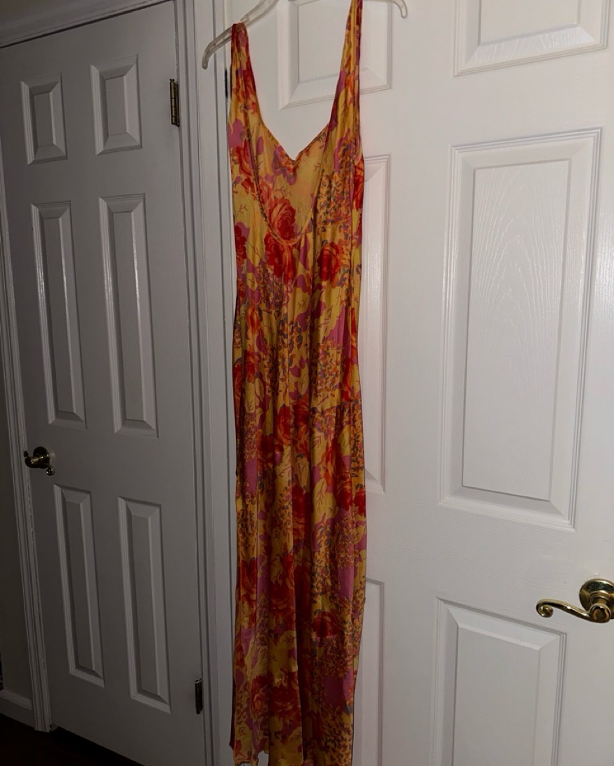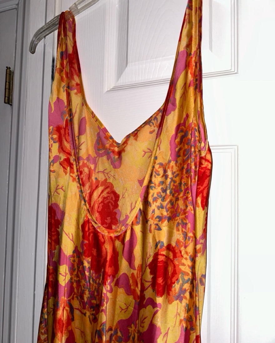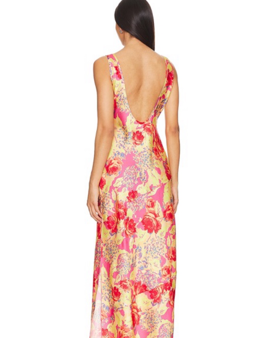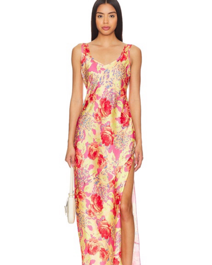 This stunning maxi dress is perfect for a summer garden party or outdoor wedding. The bold floral print and flowing silhouette create an effortlessly chic look.