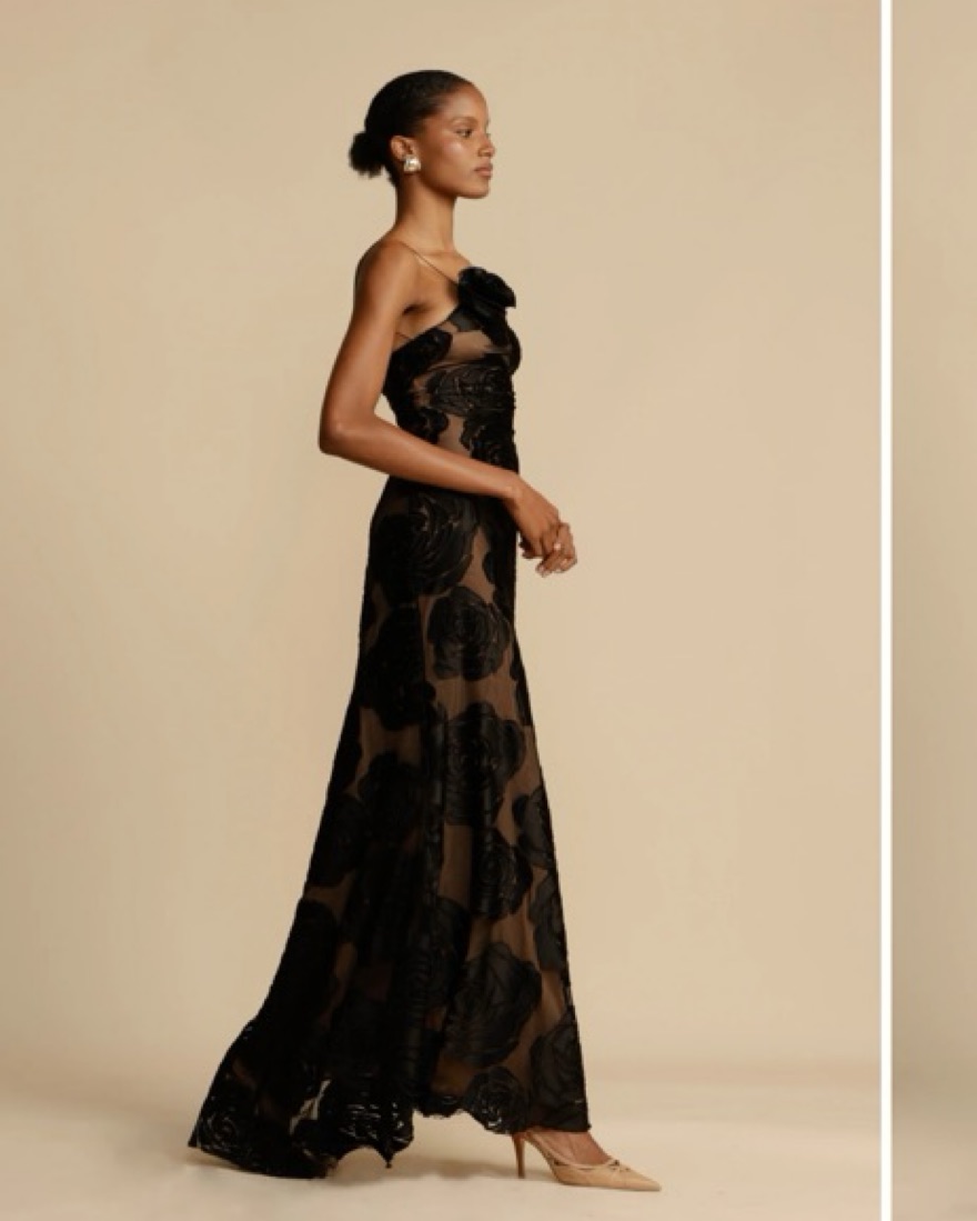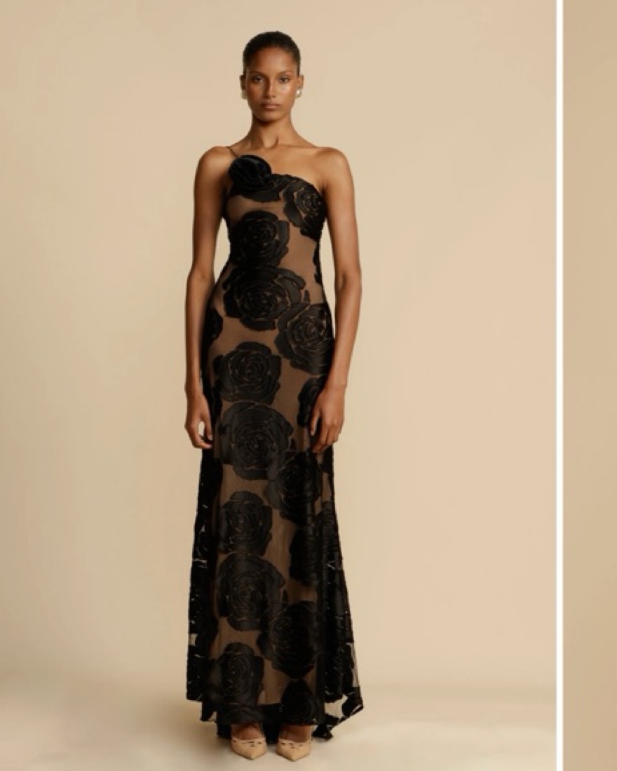 Gorgeous floor length dress with mesh and lining. Decorative flower pattern