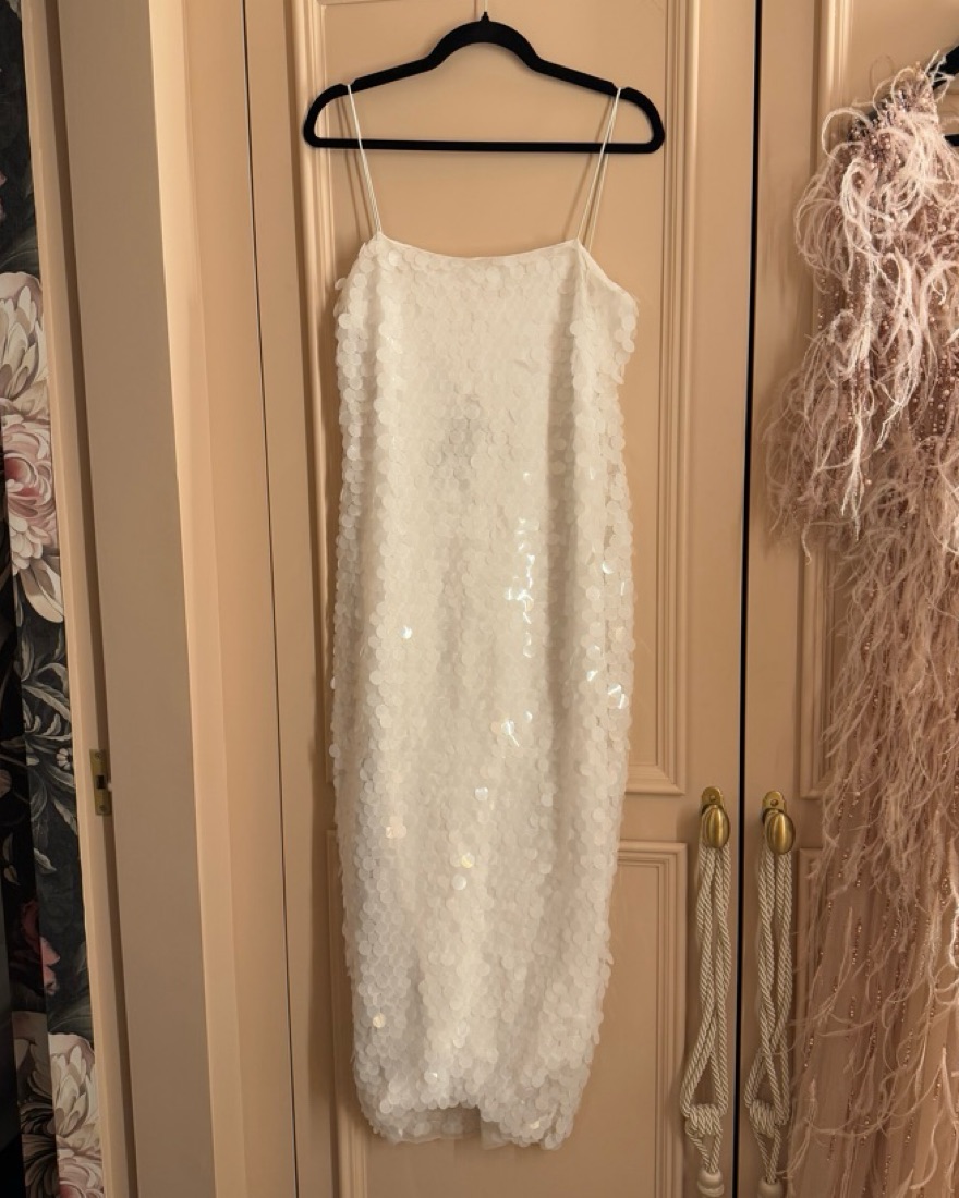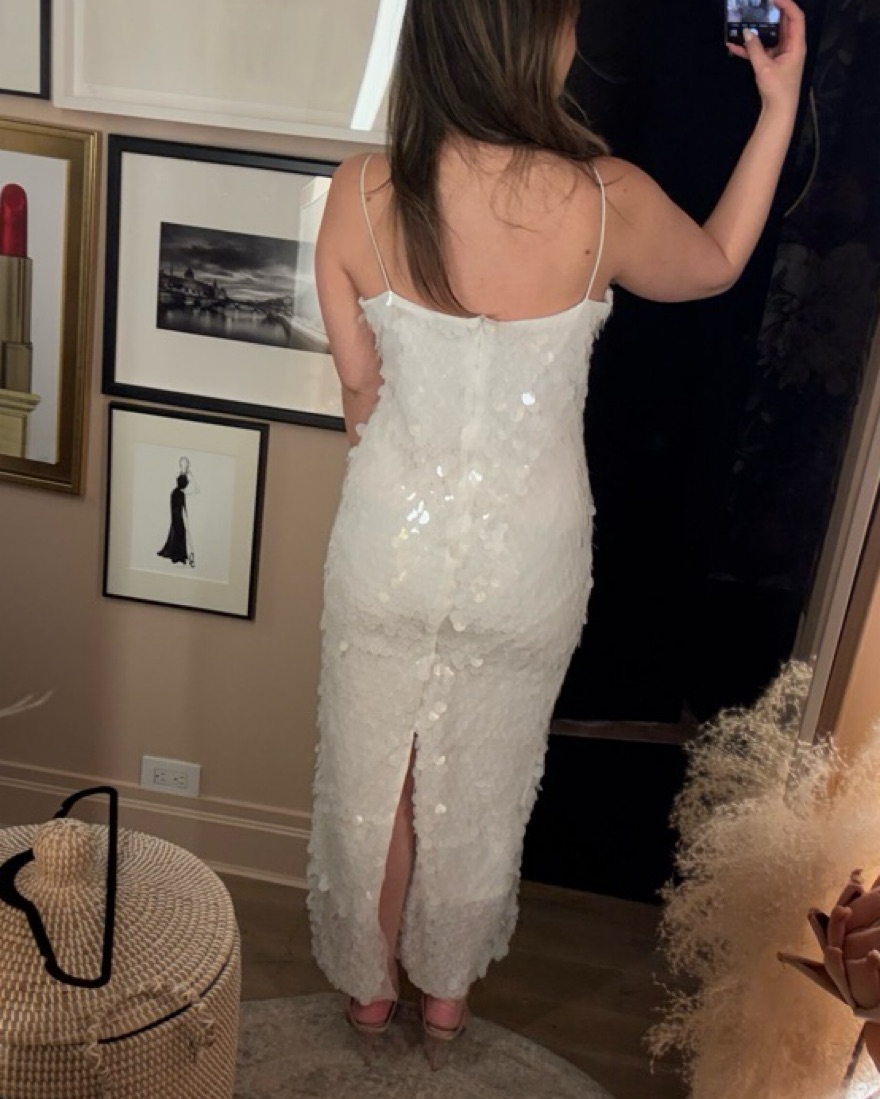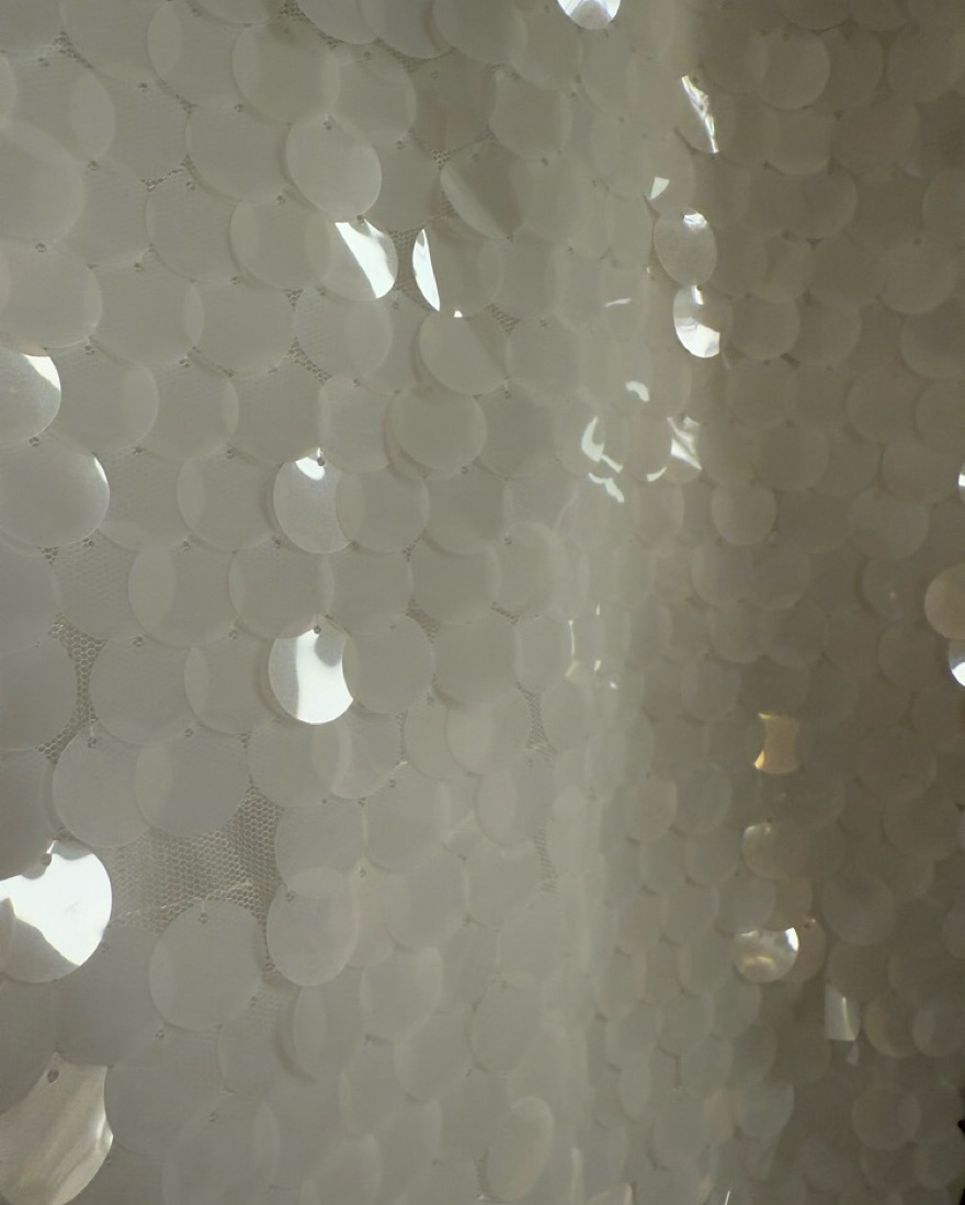 Very light and airy. Large sequins look like fish scales. Great for vacation or bride outfit. I’m a 34B and the bust has a bit more room for someone bustier. Some stretch.
