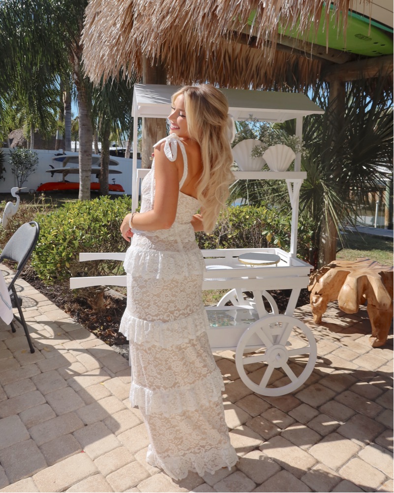 Monique Tie Maxi Dress, feminine and stunning. Lace tiered maxi dress with bow ties on straps. Wore for bridal shower