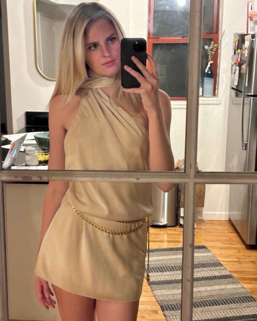 Wore this dress on my birthday, sexy but classy, asymmetrical halter with a long neck tie. I’m 5’9 for reference my friend wore it and is 5’3