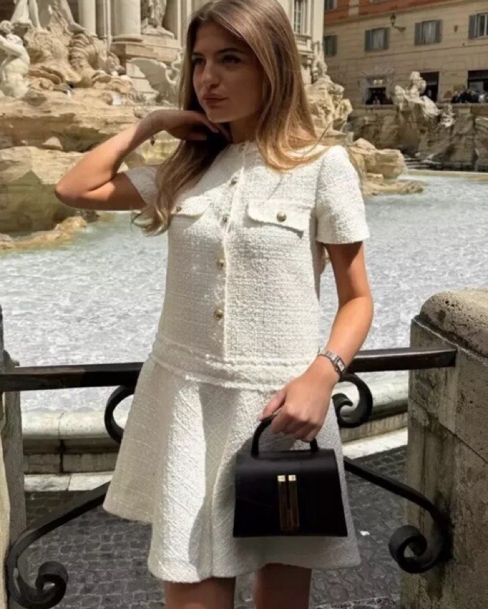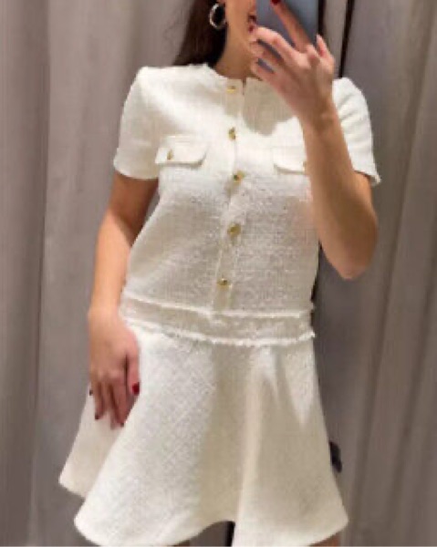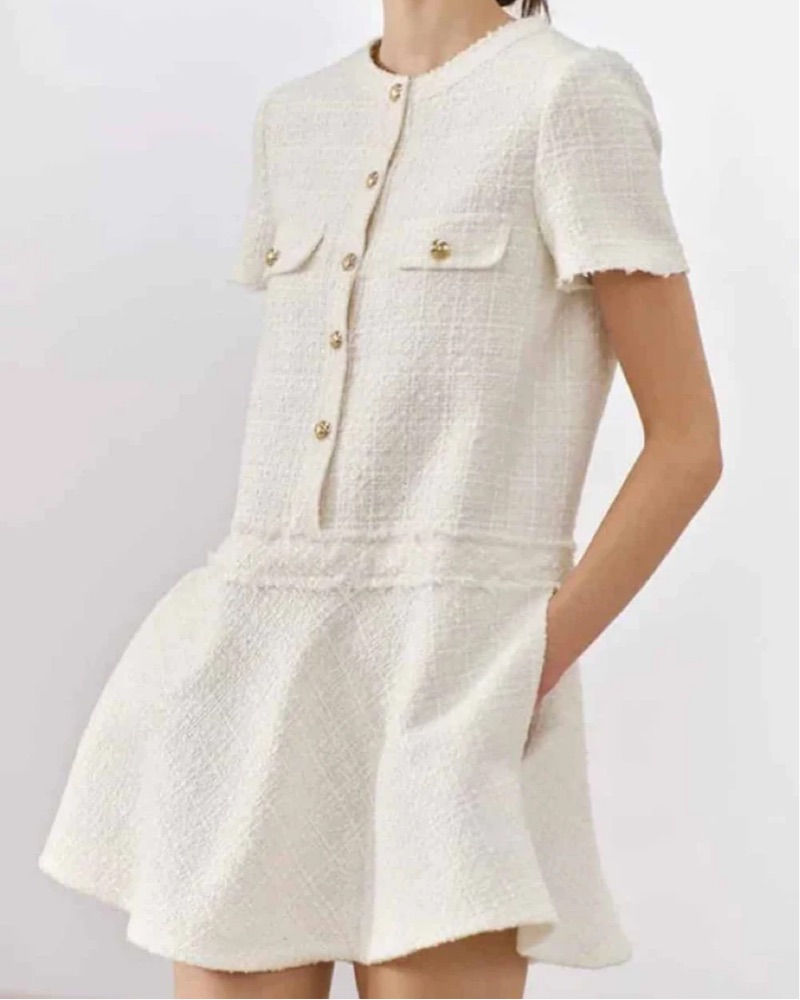 Structured cream tweed mini dress with a flattering A-line silhouette, gold button detailing, and short sleeves. Perfect for graduation events, bridal events, or going into the office.
