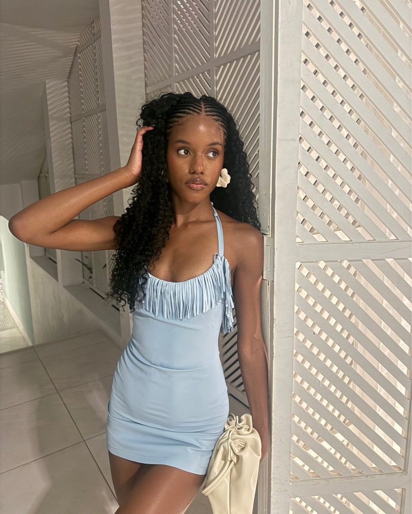 Sweet, flirty, and full of charm. This halter mini dress features delicate fringe detailing that moves with you, adding the perfect touch of fun. Made from a soft fabric that hugs your shape. The baby blue hue and playful silhouette make it your go-to for daytime dates, brunches, or wherever