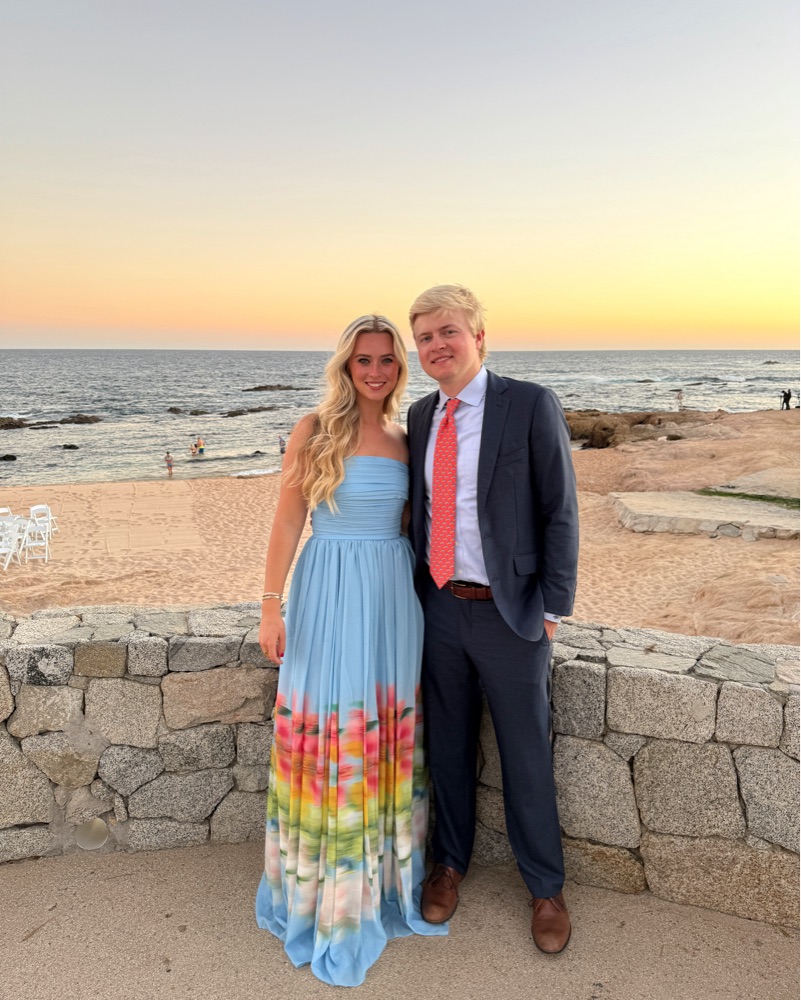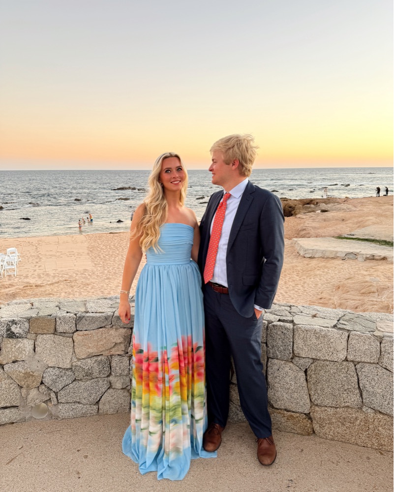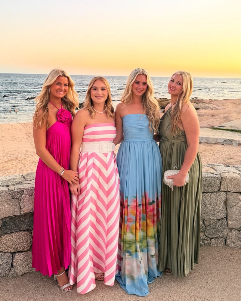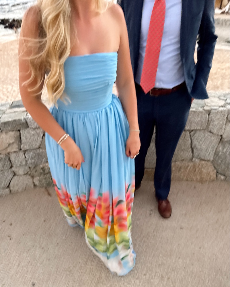 This gorgeous maxi dress is perfect for a sunset beach gathering or summer wedding! The colorful floral print and flowing silhouette create a truly eye-catching look. Prepare to be best dressed !!