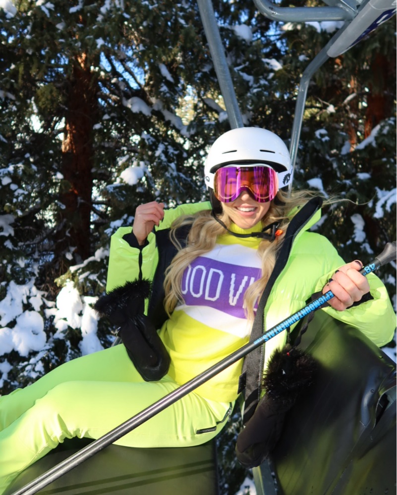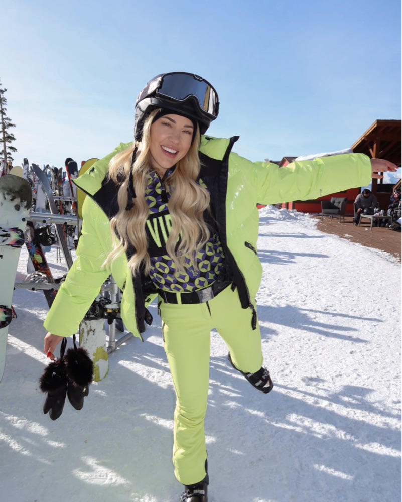 This bold, neon ski outfit is perfect for hitting the slopes in style. The bright colors and fun graphics will have you standing out on the mountain. 3 pieces: jacket, pants, mid layer
