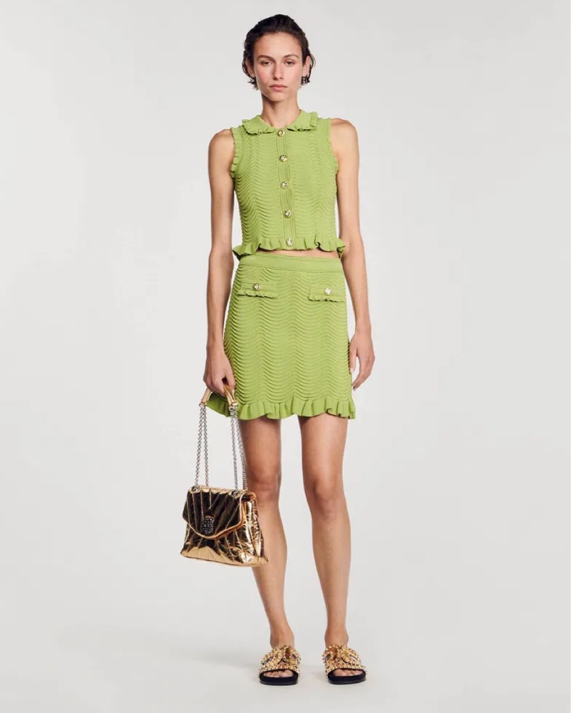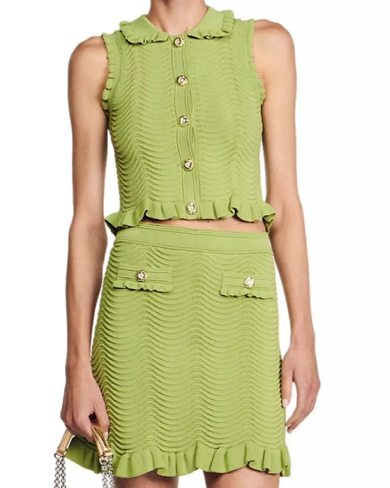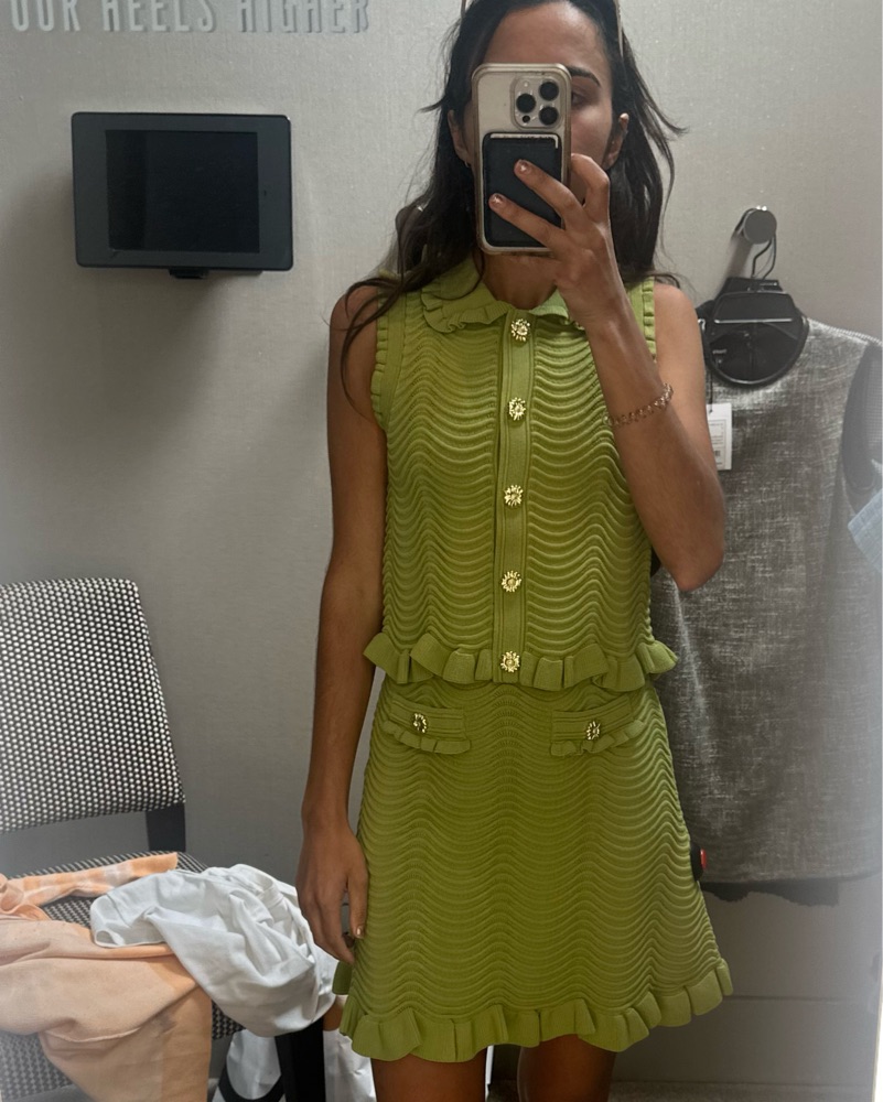 Matching sleeveless top and skirt with gold flower buttons. Soft knit material. Olive green. Perfect for a garden party, brunch, bridal shower, etc.