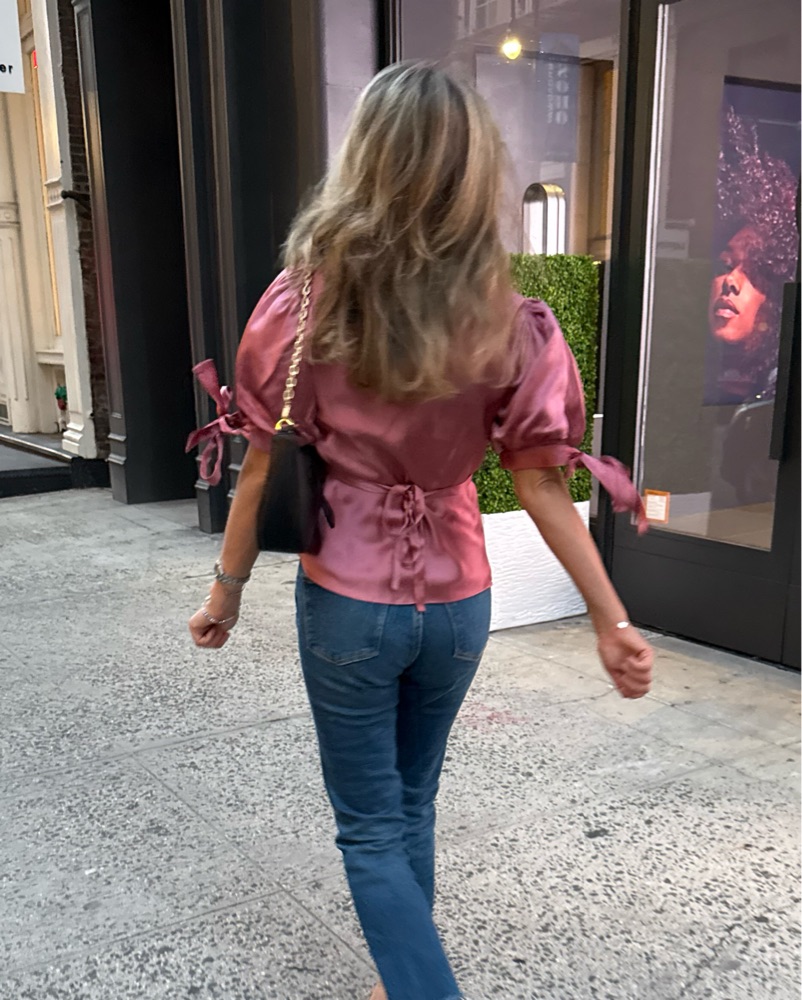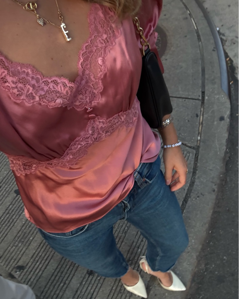 This elegant satin blouse features delicate lace detailing, creating a feminine and flirty look. Pair it with your favorite jeans for a chic, date-night ensemble.