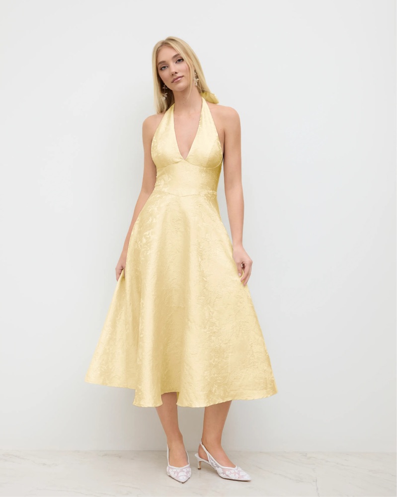 The most gorgeous halter-neckline lace dress, thick structured material with cinched waist. Never worn! 💛 Inspo for: wedding, date night, brunch