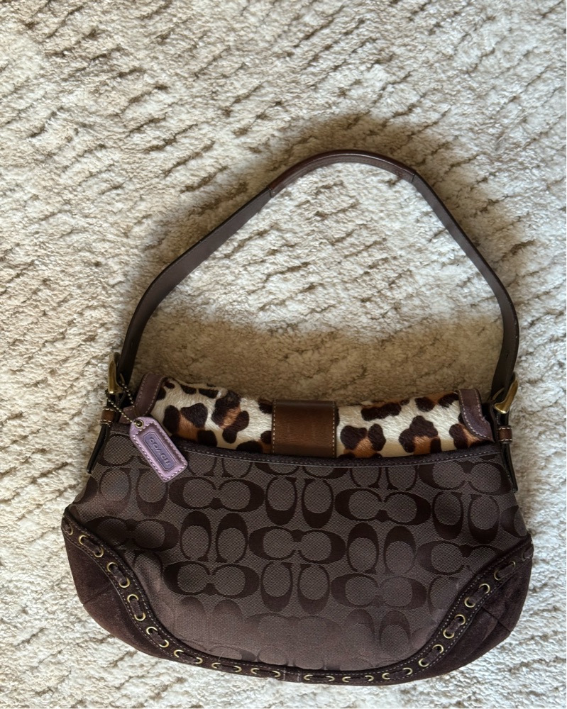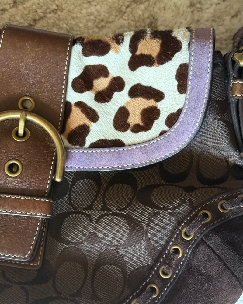 Extremely rare vintage coach bag with a leopard print pony hair detail, and lilac trim