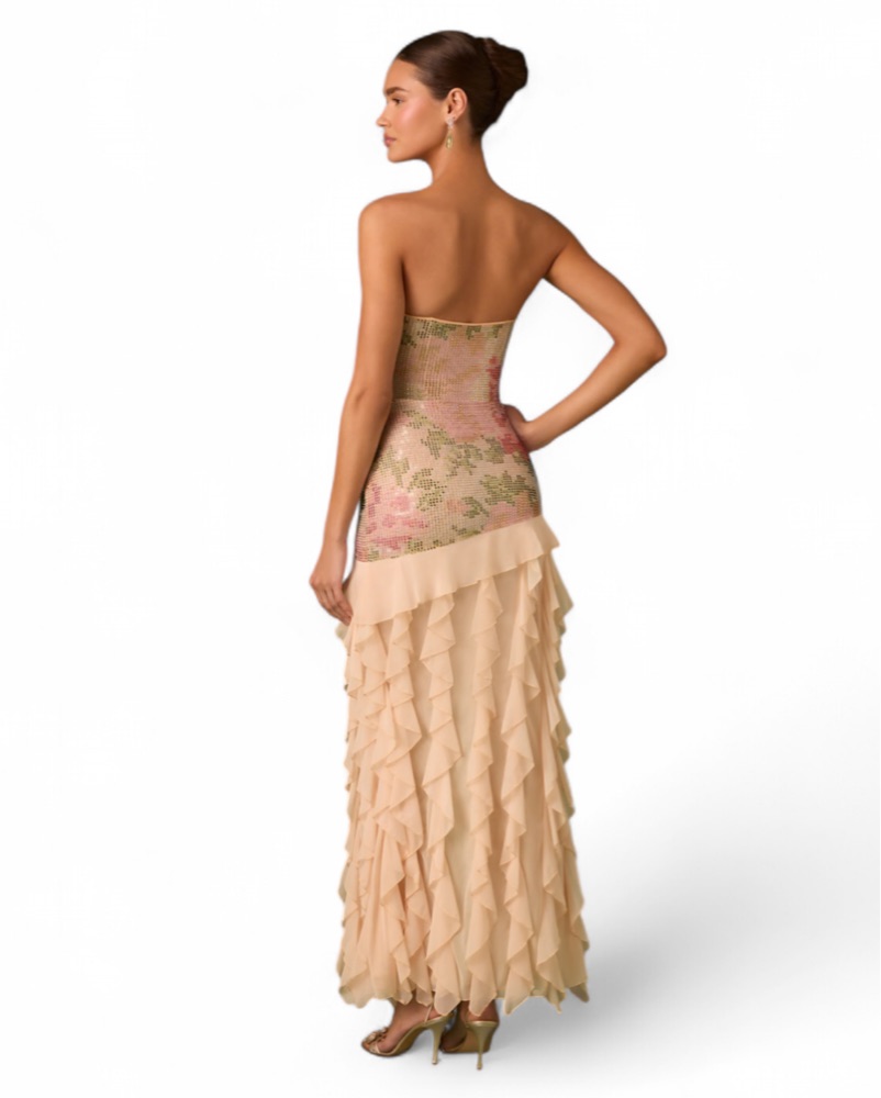 This elegant floral maxi dress is perfect for a summer event or special occasion. The ruffled skirt adds a whimsical touch while the fitted bodice flatters the figure.