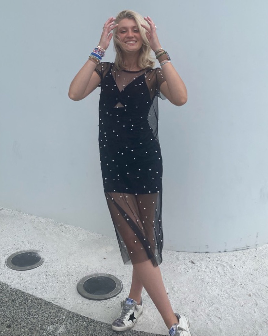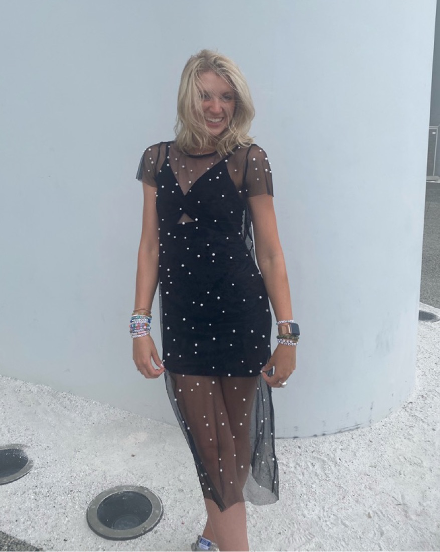 This is a sheer knee length mesh dress, intended to be worn over a dress, or however you choose to style! The pearls are platic, and cover the full dress, slightly uncomfortable to sit.. better for a “standing” event (think party, club, concert).