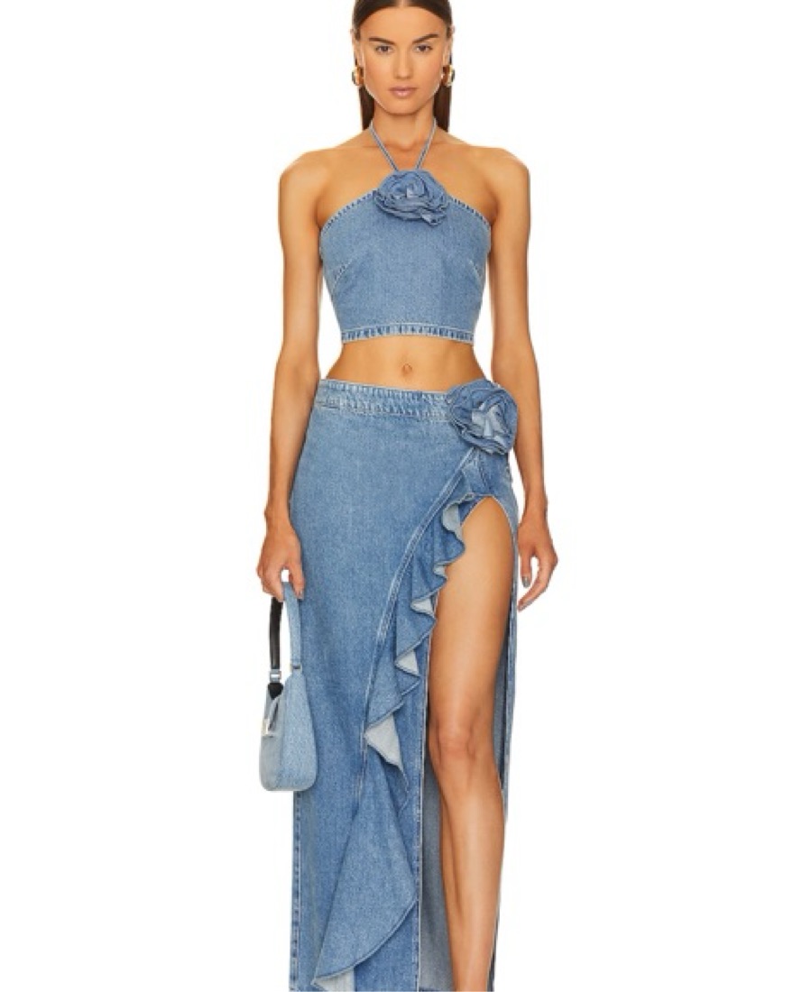 Lovers and Friends Exposed back zipper closure Halterneck tie closure Rosette at front Denim fabric
