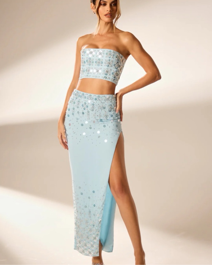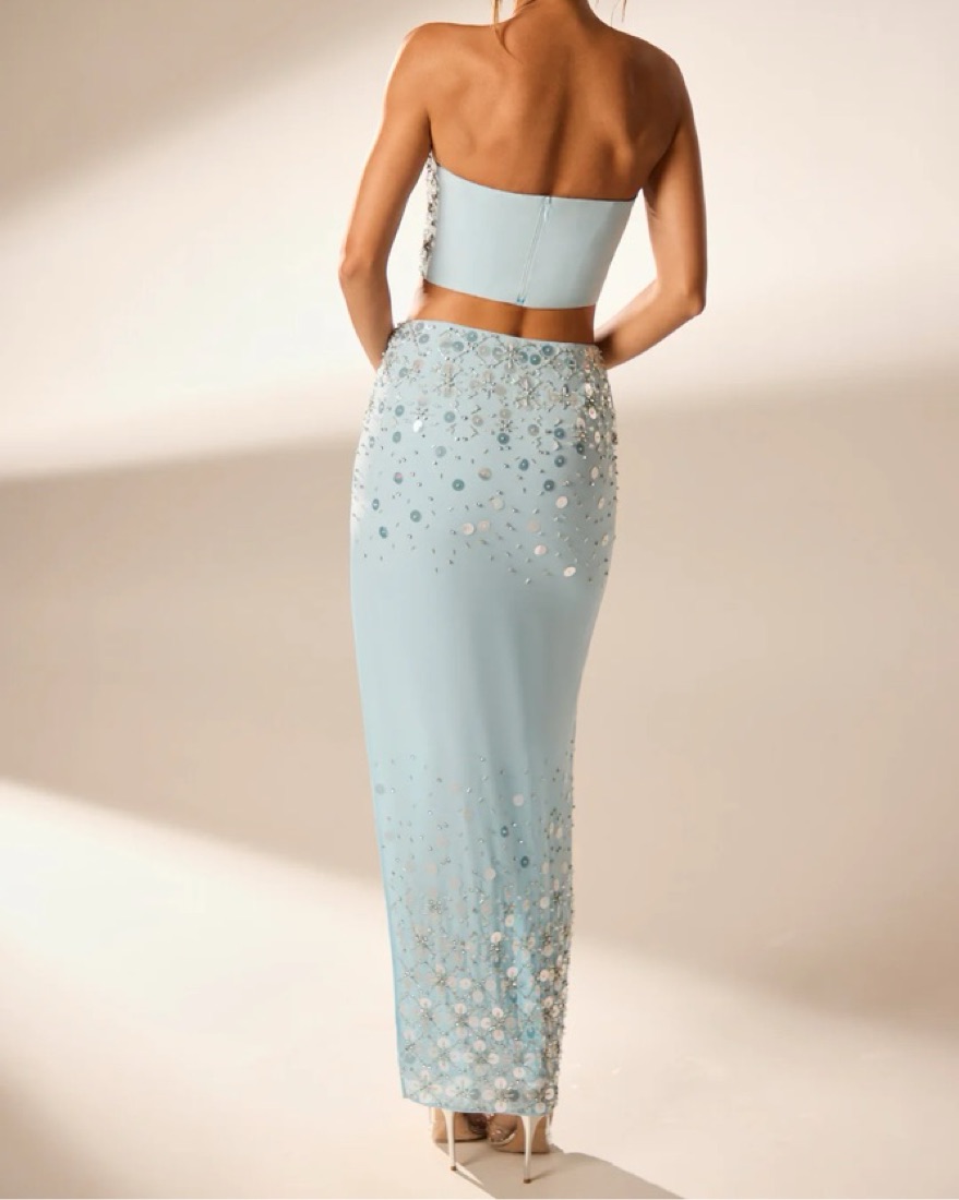 Gorgeous hand embellished light blue maxi skirt from Oh Polly - can be worn alone or as a set (corset top also available to rent). Have gotten so many compliments on this set.