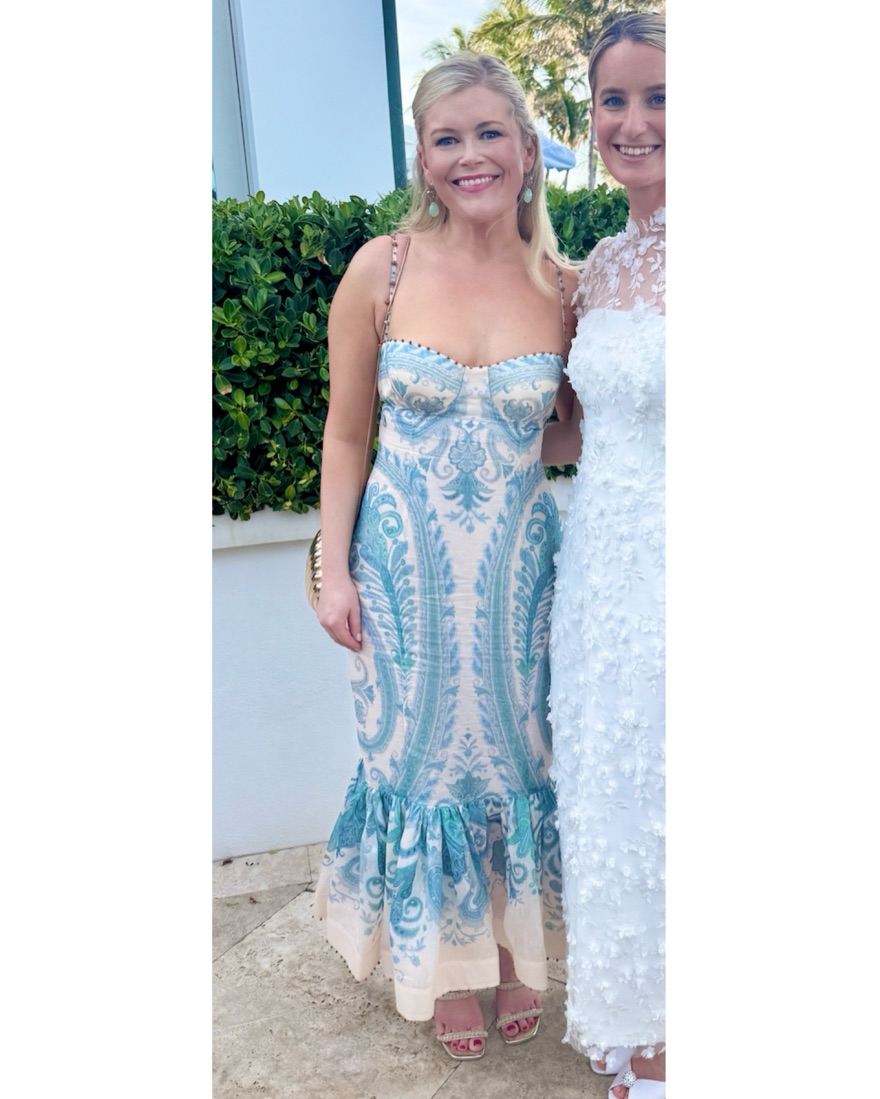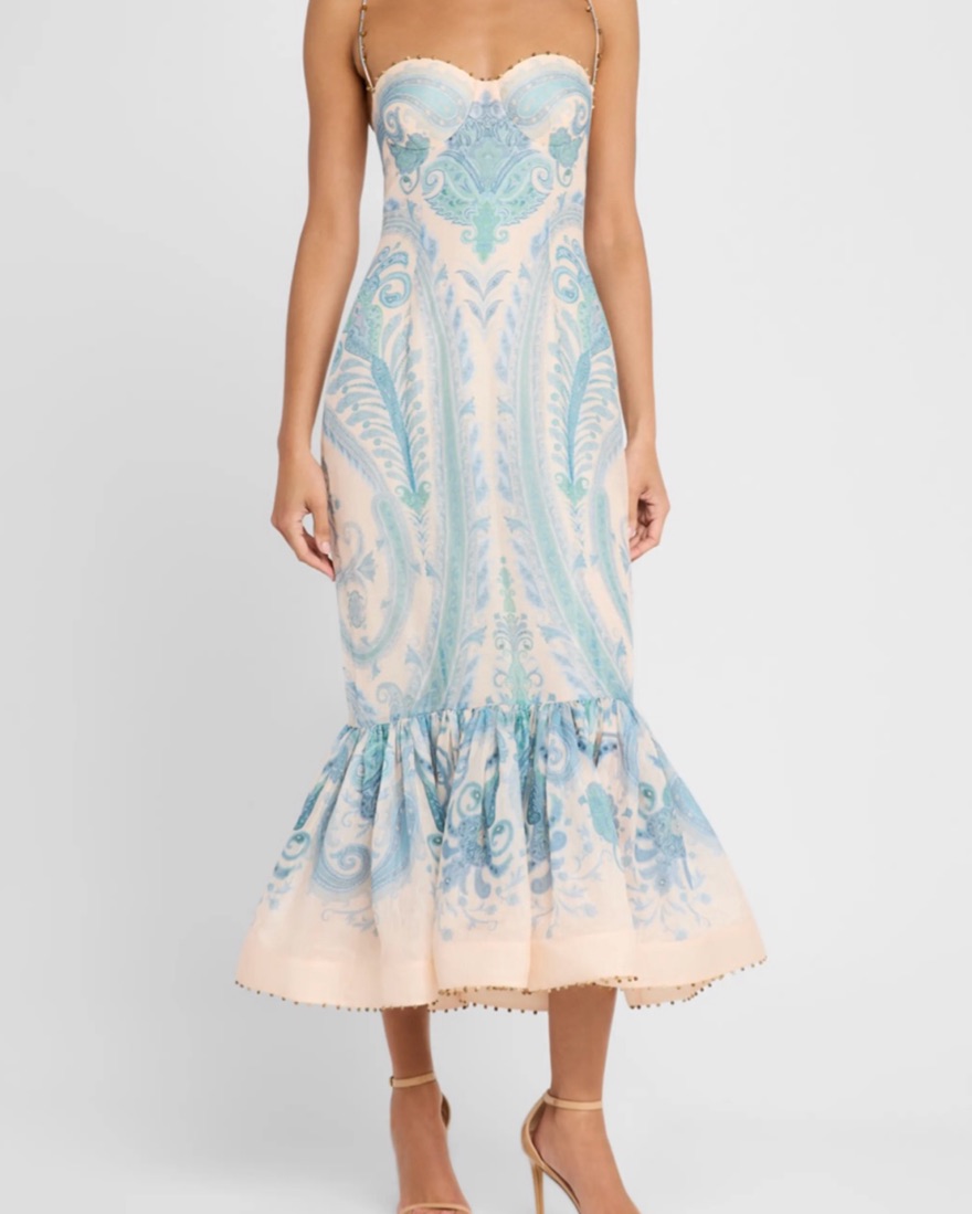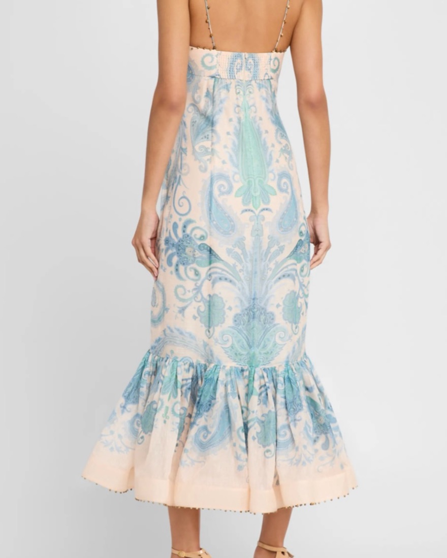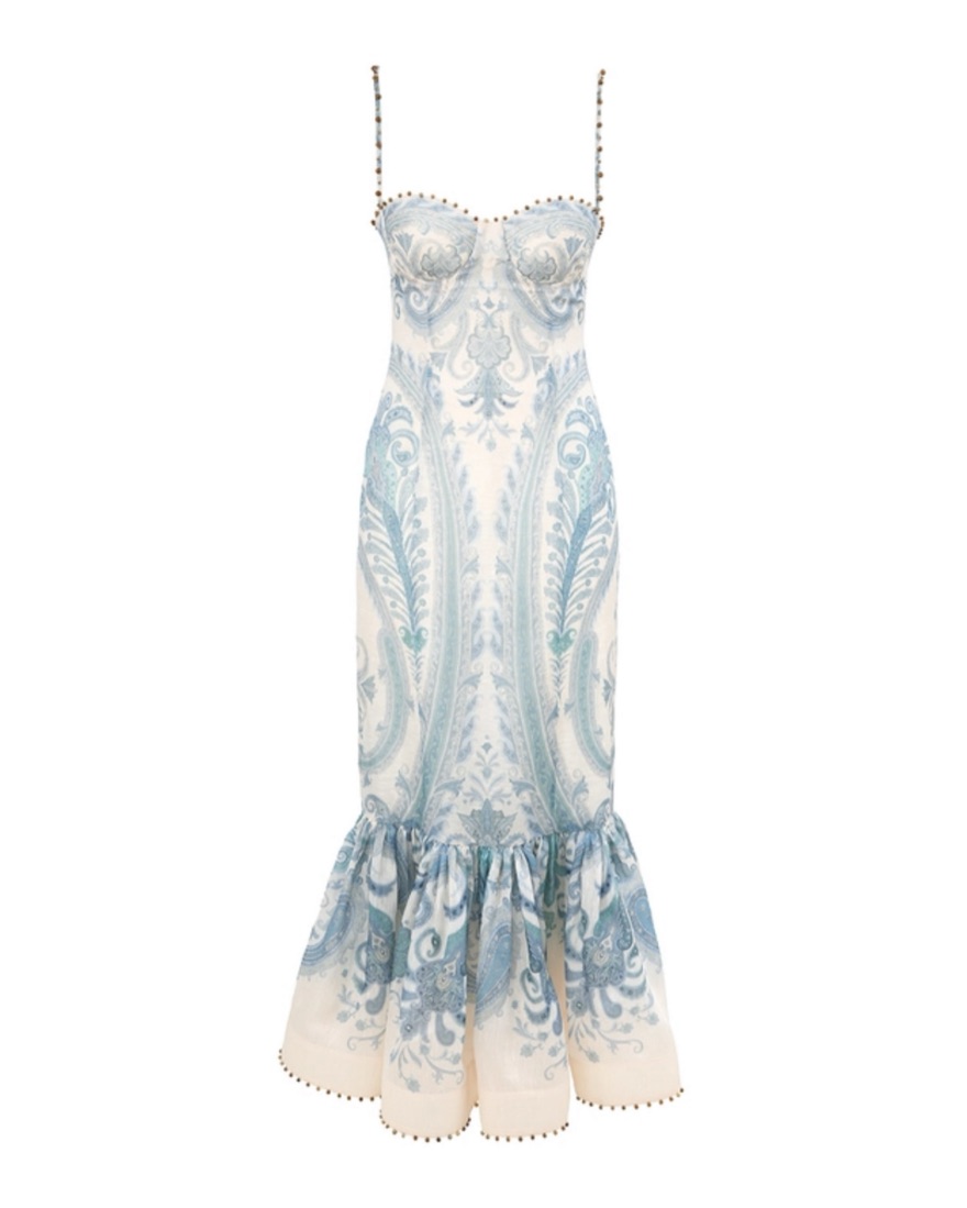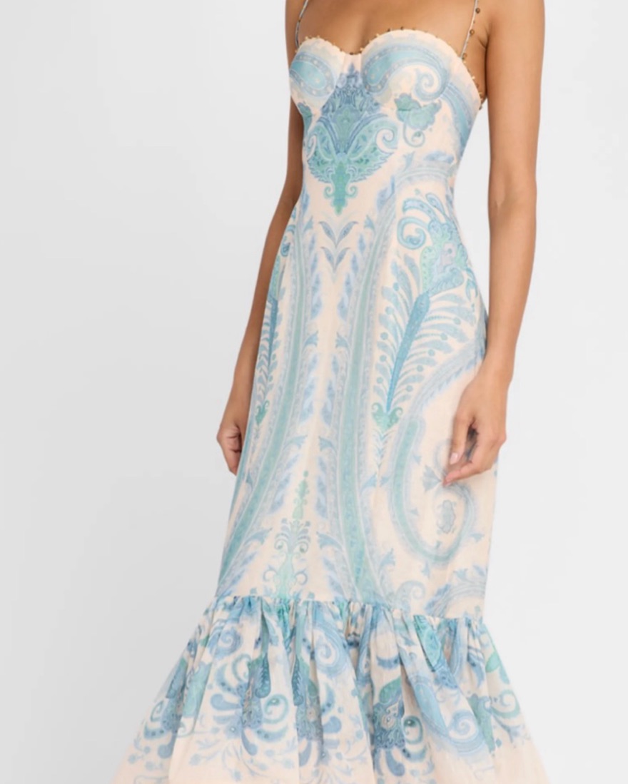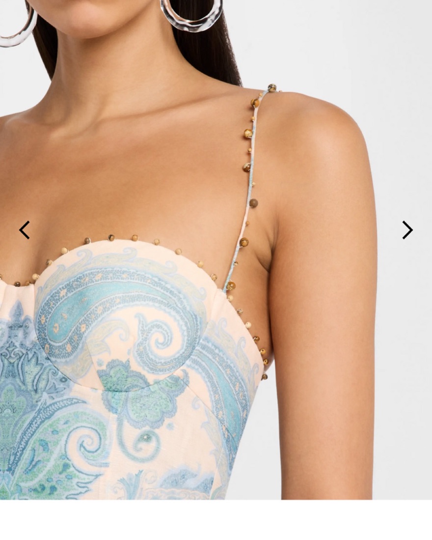 Zimmermann size 2. Cool iron/ light steam only. MINOR discoloration on interior cups from self tanner- not visible on outside. A silk linen maxi dress featuring a sweetheart neckline with beaded trims on the top edge, straps, and hem, finished with moulded cups and a shirred back panel.