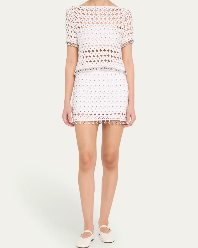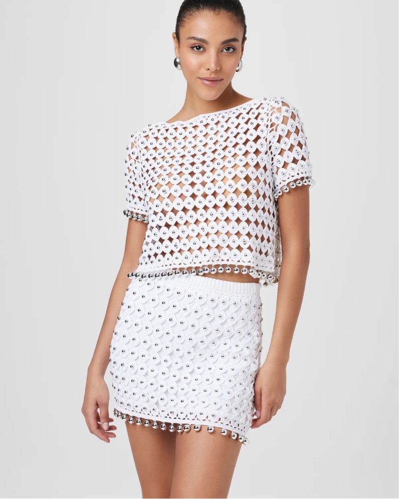 Optic beaded set with silver beads- perfect for bachelorette or bridal events! This is a 2 pc set- top and skirt ! Skirt is fully lined, top is unlined.