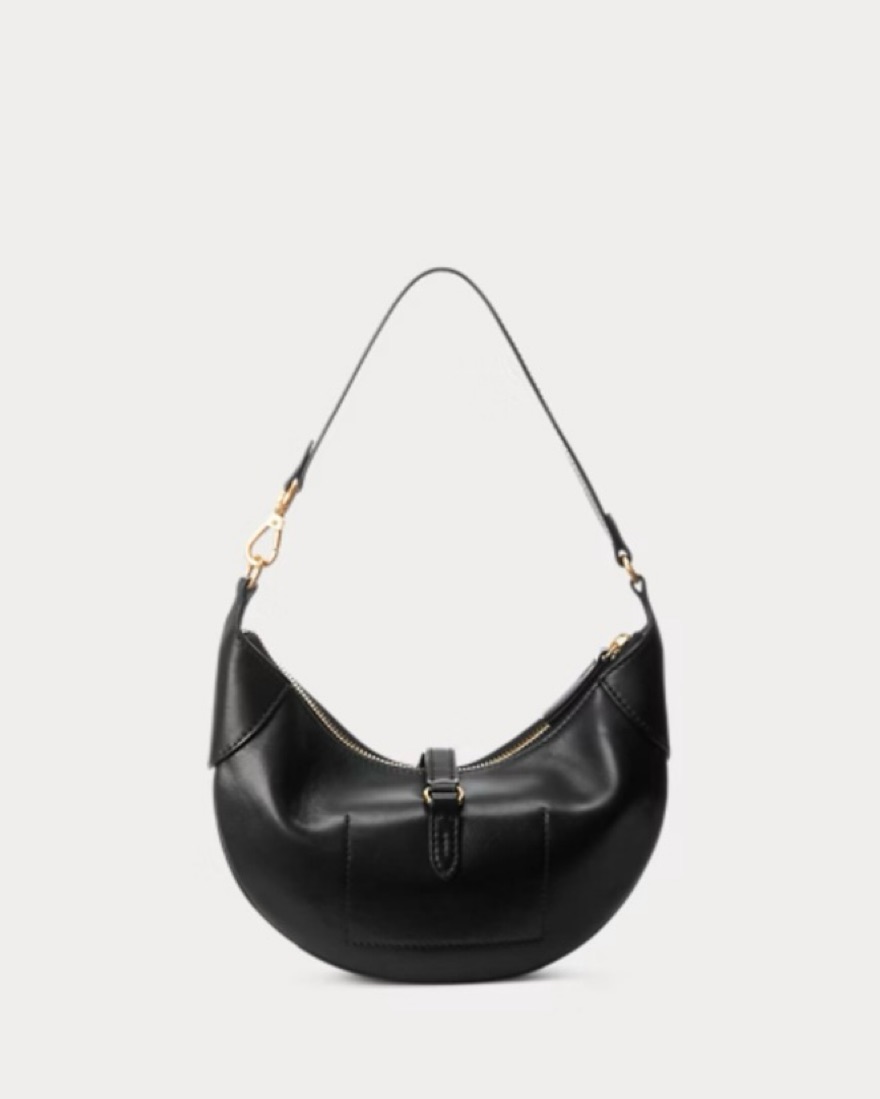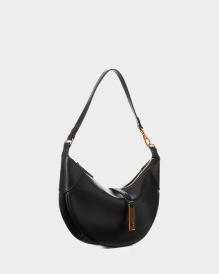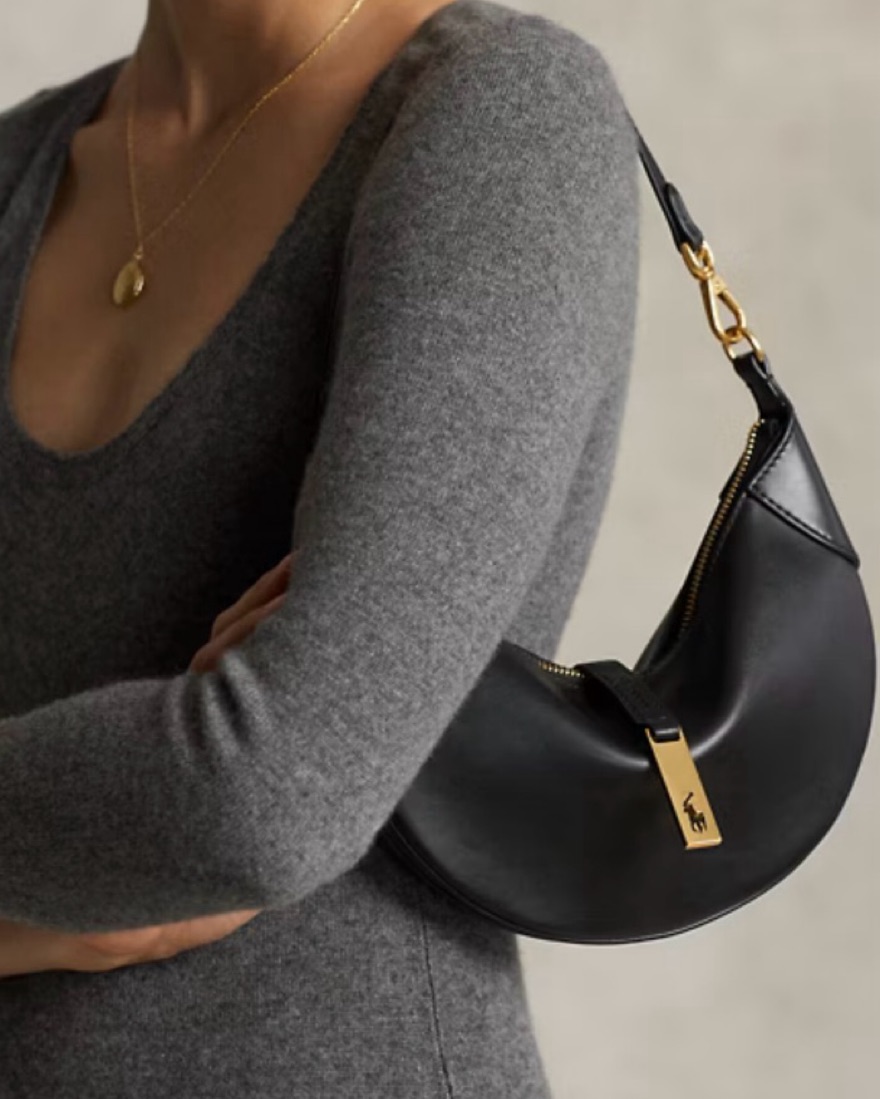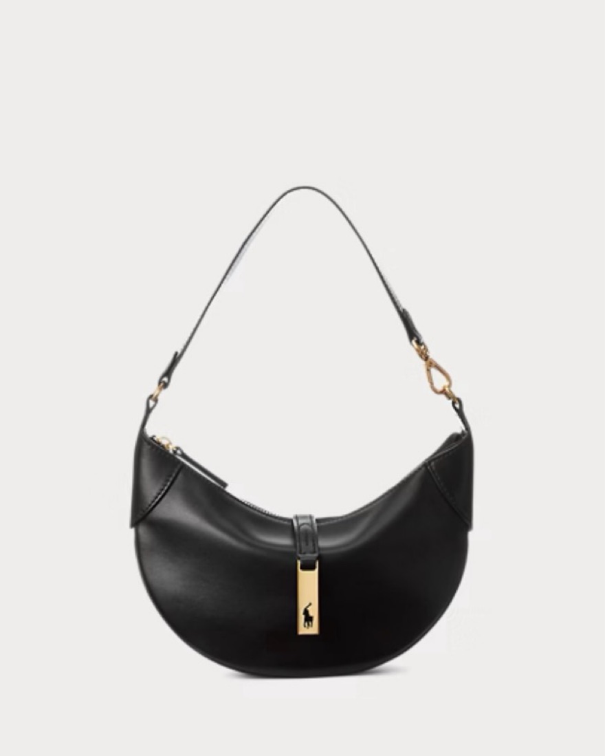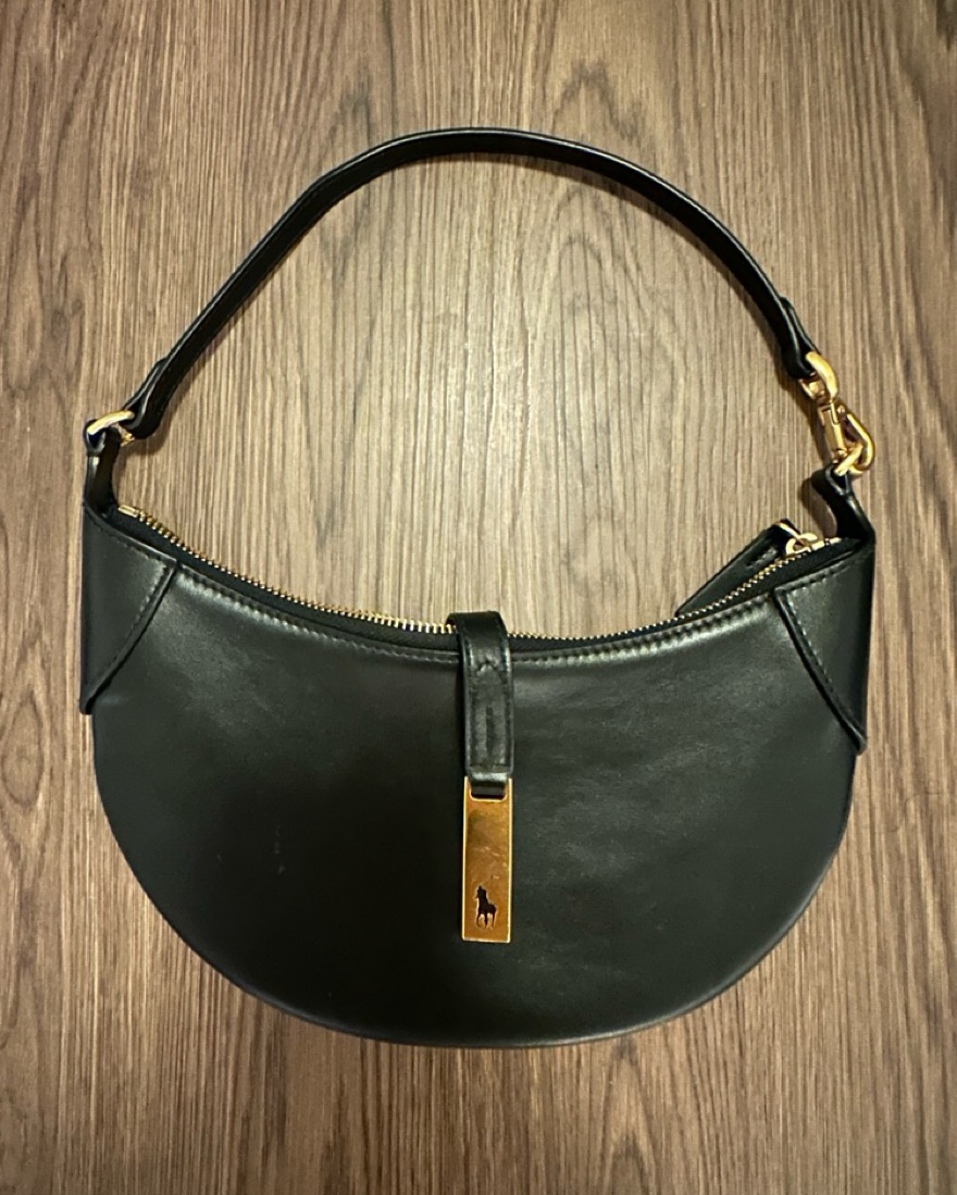 Black polo ID calfskin bag from Ralph Lauren with gold hardware. Great bag for dressing up for a dinner or going out. Small, but fits the essentials (phone, wallet).