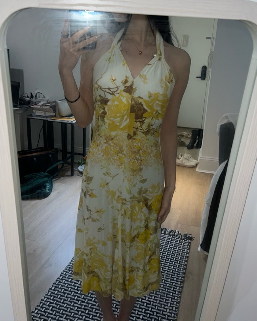 Beautiful floral yellow/gold backless Roberto Cavalli (2001) dress with diamond detail on neck straps. Stretchy fabric good for Small-Medium