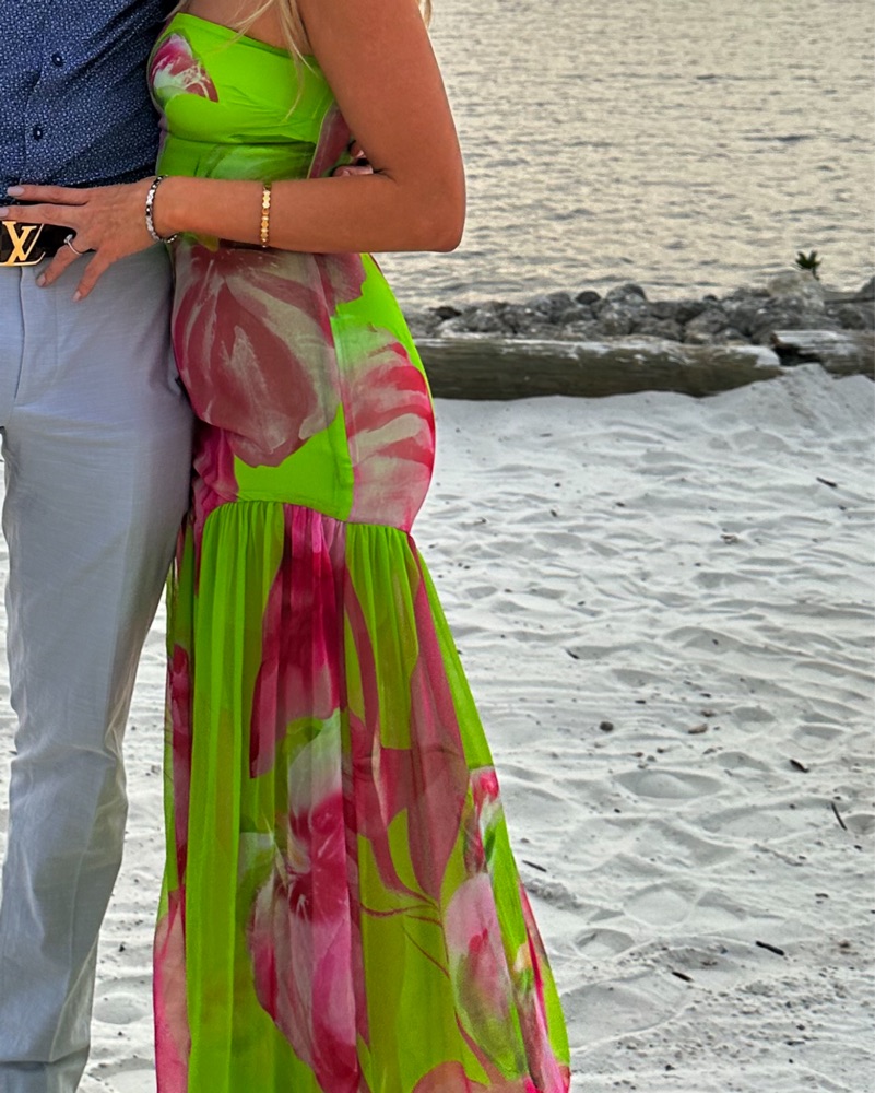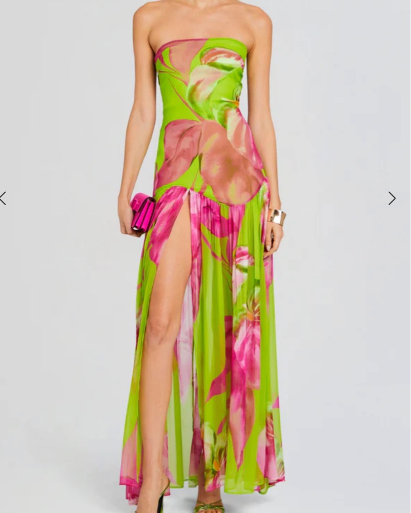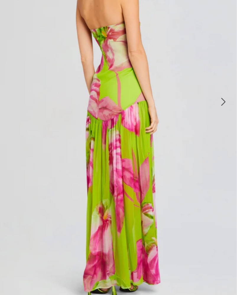 This stunning floral maxi dress is perfect for a tropical destination wedding or an outdoor summer party. The vibrant colors and flowing silhouette will have you feeling confident and stylish. Size xs tailored to fit 5”3 in heels . Return dry cleaned.