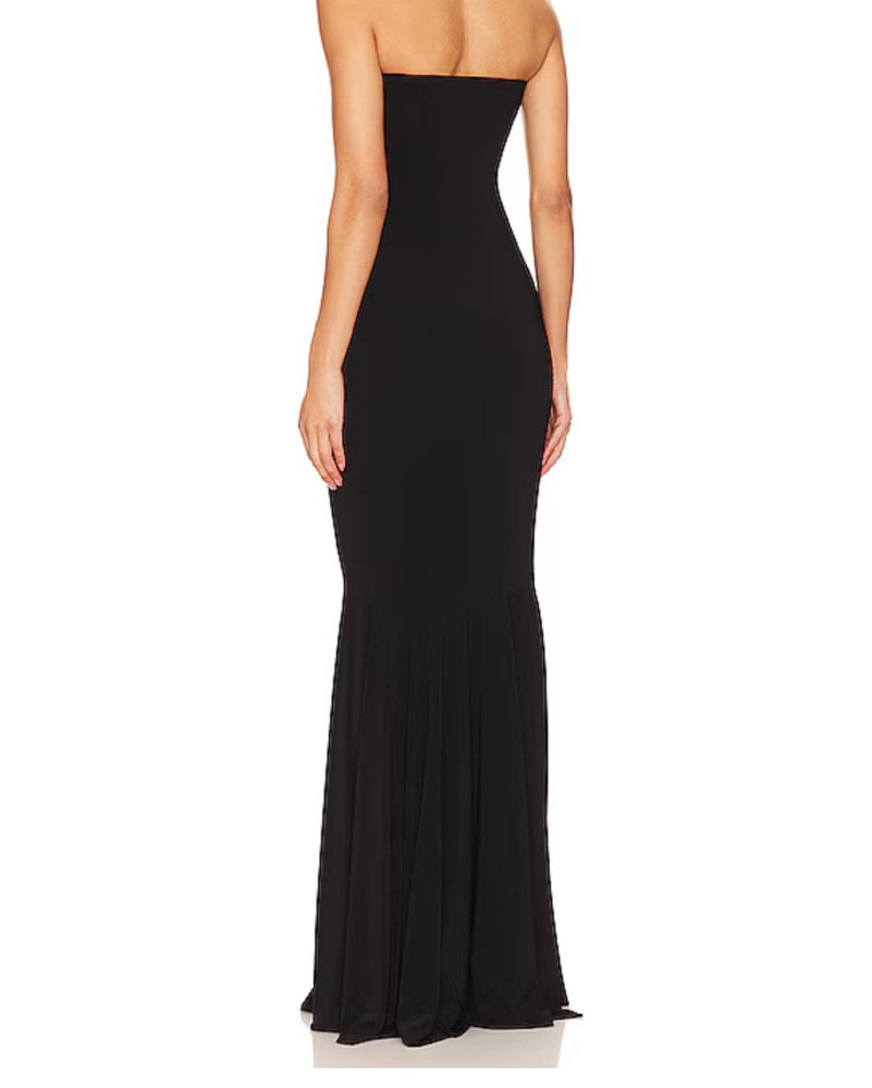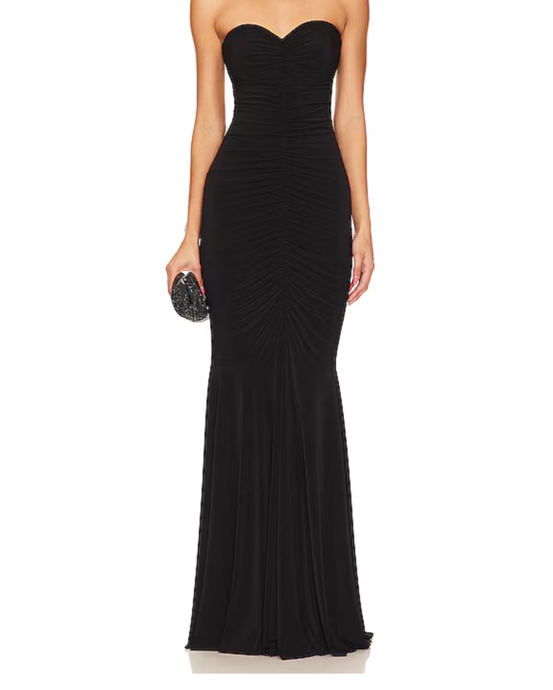 This stunning black gown is perfect for a formal event or black-tie affair. The shirred front and fishtail skirt create a flattering, figure-hugging silhouette. Stretchy great comfortable material.